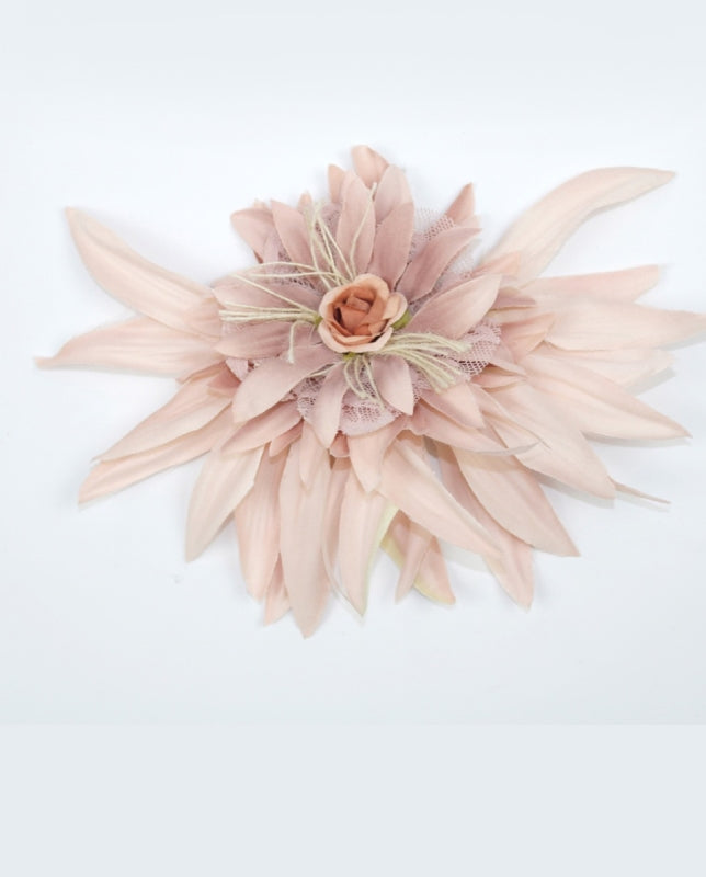 Esta cintura de flores puede acompañar a cualquier vestido, esta compuesto por flores y tul de tono rosa palo decorado además con diversos apliques decorativos.
