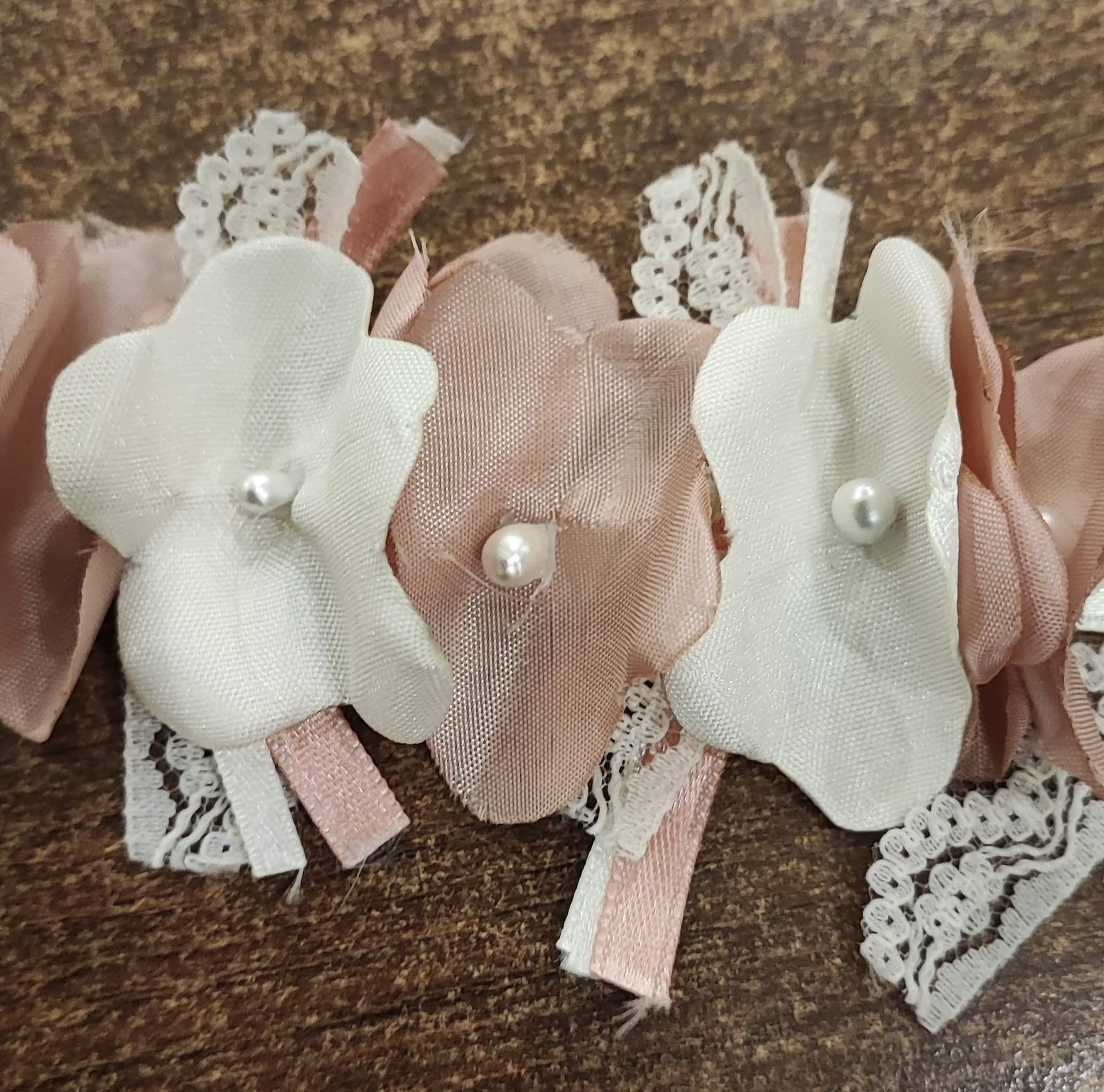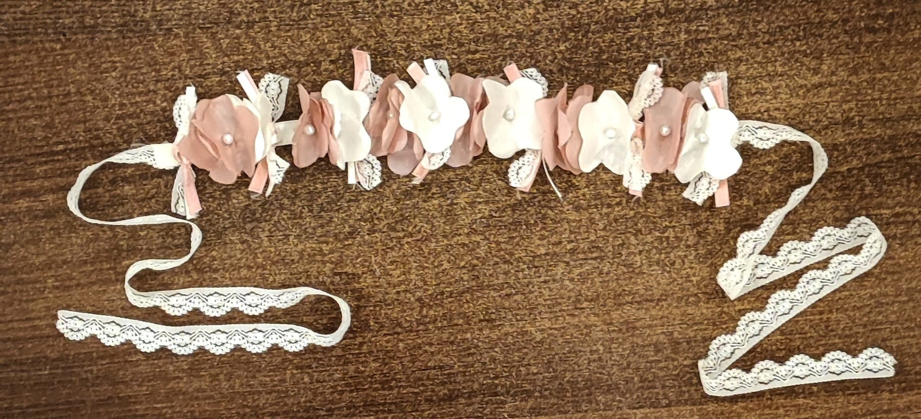 Cintura con cintas para atar en la espalda con flores en color rosa palo y crudo.