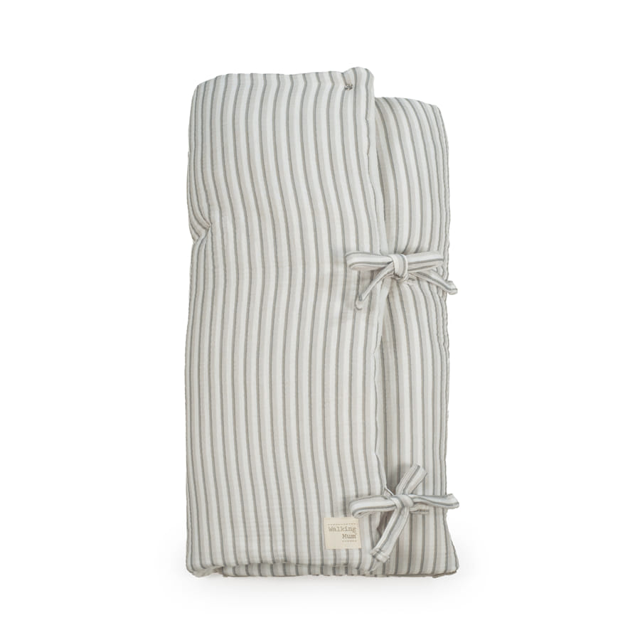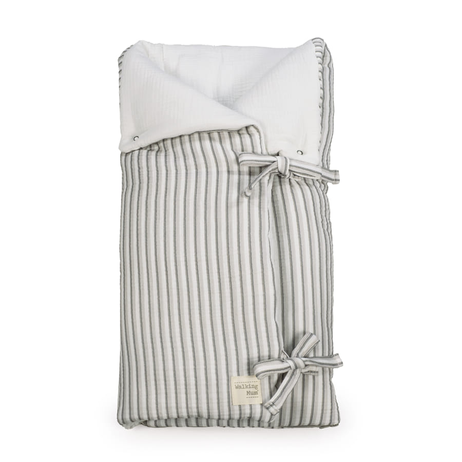 Saco arrullo o saco manta Botton con estampado de rayas. Está fabricado con una suave muselina 100% algodón. Ideal para los primeros dias del bebé. Es perfecto para los primeros paseos en el capazo. Se convierte en una manta para la cuna. Practico cierre tipo sobre con lazos y cierre con cremallera en la parte inferior en los pies para que el bebé esté abrigado. Gran calidad y mucho estilo. Fabricado en materiales resistentes y de fácil limpieza a mano o a máquina a 30 °C. Walking Mum protege a tu bebé utilizando los mejores tejidos, libres de colorantes azoicos y sustancias nocivas para la salud. Nuestra colección Walking Mum está diseñada con un particular sello de estilo urbano y moderno que no pasa desapercibido, para vestir diferente los paseos con tu bebé. Los accesorios de esta línea son más sport y prácticos, especialmente pensados en mamás y papás modernos que aprecian los diseños más actuales y en tendencia sin dejar de lado la calidad y la funcionalidad de los complementos que hacen más cómodos todos los paseos con sus bebés. Especificaciones: Materiales: 100% algodón. Medidas cerrado 38×73 cm y abierto 97×73 cm.