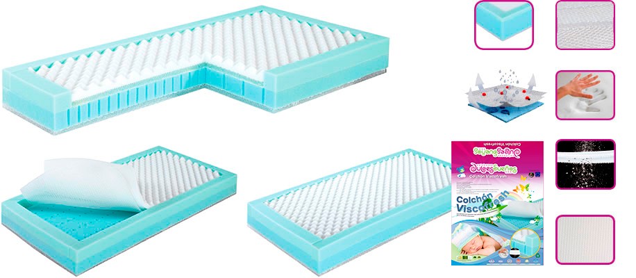 Además de las óptimas condiciones de higiene y transpiración de esta composición, se incorpora la viscoelástica, apoyo ideal para el bebé por su alivio de presión y su cualidad de SUAVE adaptación a todo el contorno.