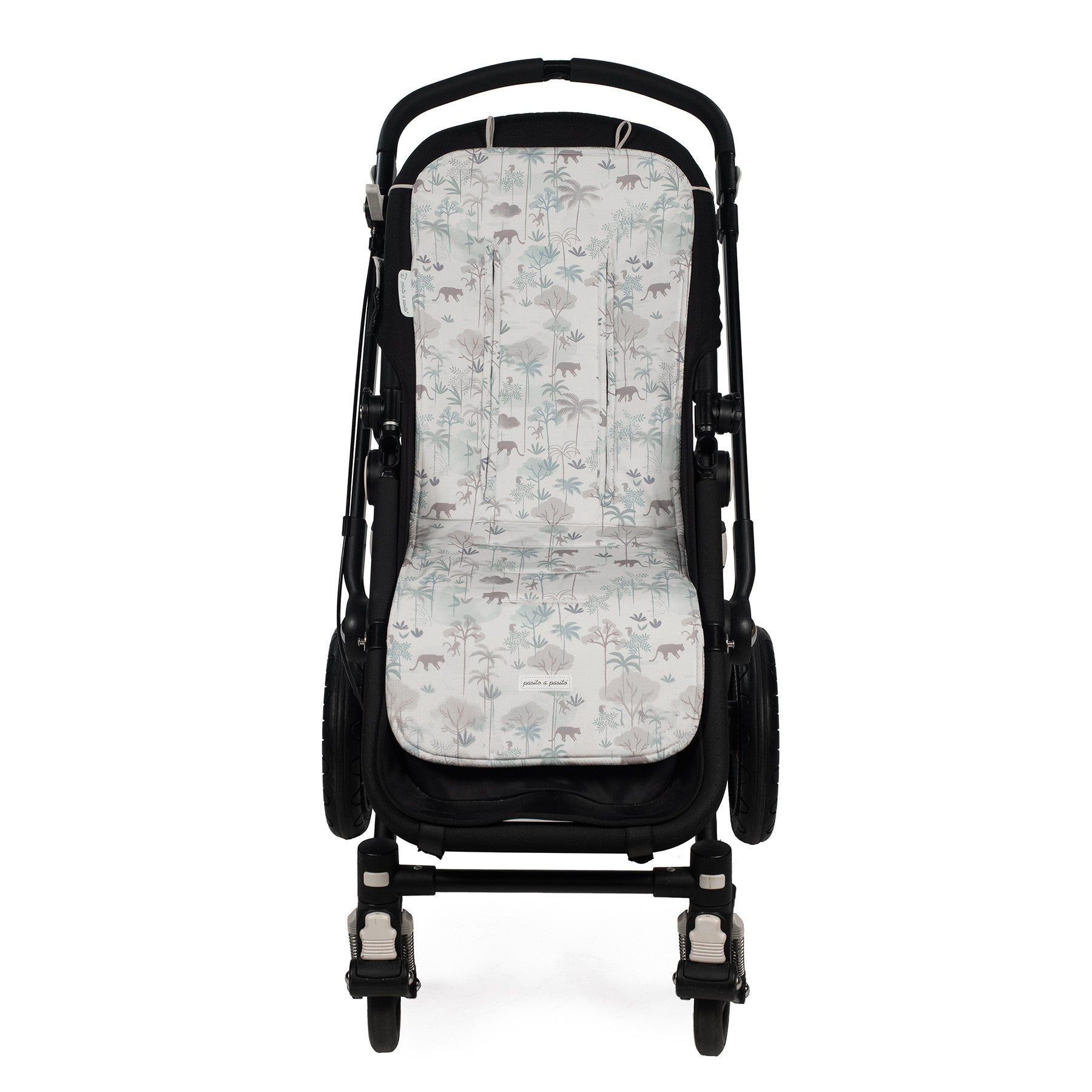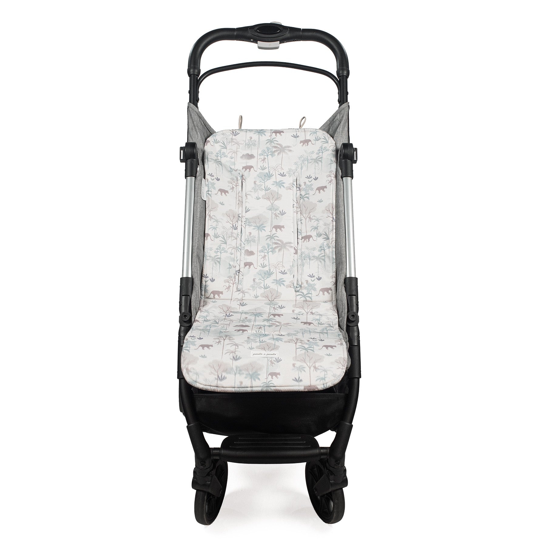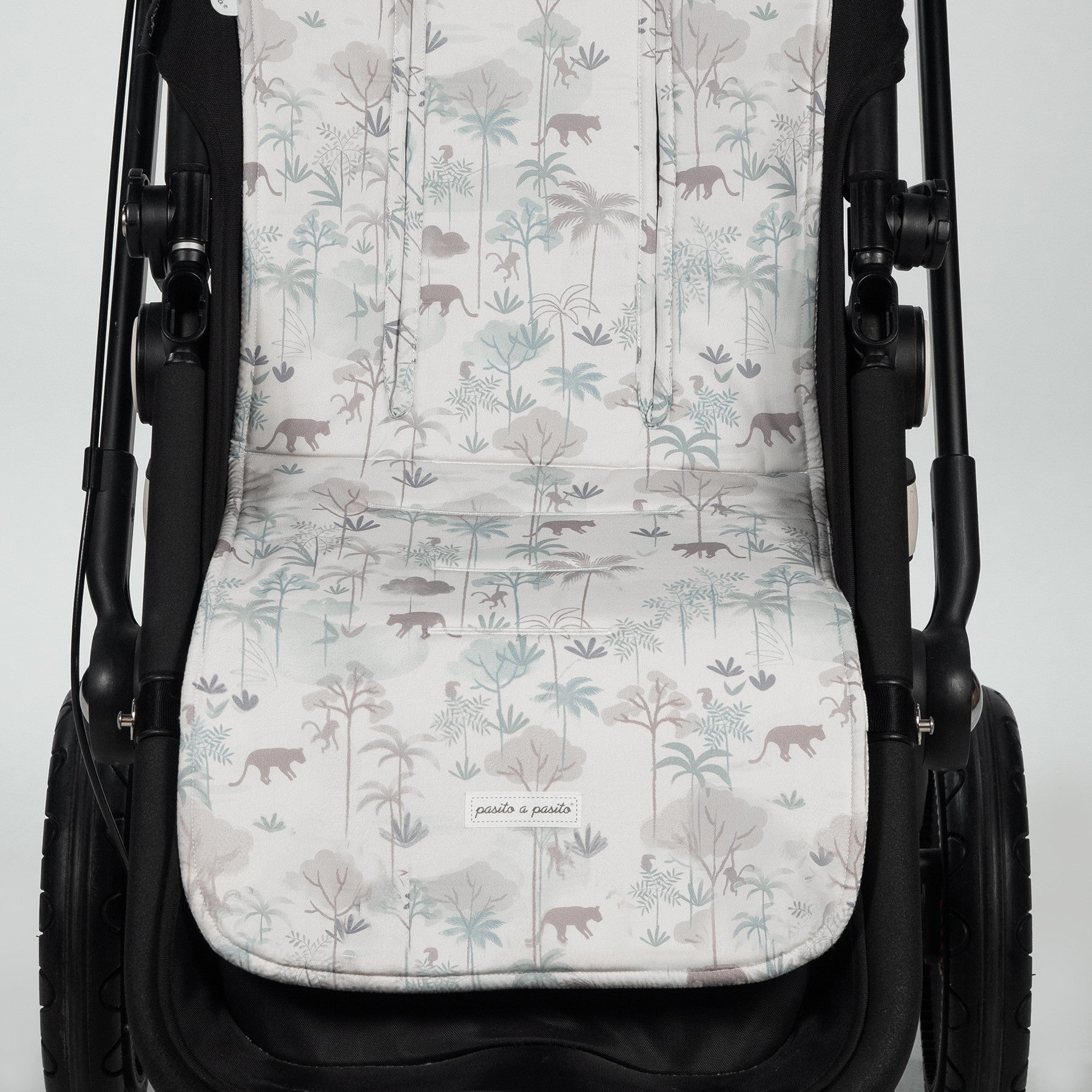 La colchoneta Serengueti en tela estampada beige de Pasito a Pasito es la cobertura ideal que se adapta a la mayoría de las sillas de paseo y darle mayor comodidad a tu hijo durante sus paseos en días calurosos.