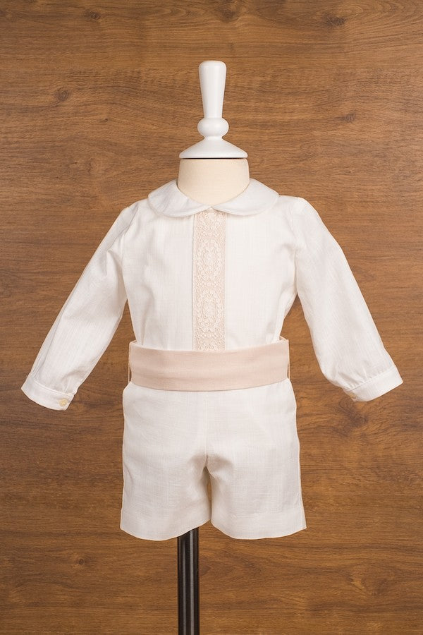 Este elegante conjunto para niño, perteneciente a la colección Mikamama, es perfecto tanto para bautizos como para ceremonias especiales. Está confeccionado en lino de alta calidad, que garantiza frescura y comodidad durante todo el día. La camisa de manga larga destaca por sus delicadas puntillas que recorren el frontal, además de un cuello bebé que aporta un toque clásico y refinado. El pantalón corto, completamente forrado, ofrece mayor comodidad y libertad de movimiento. Para complementar el look, incluye un fajín en tono tostado que armoniza con las puntillas de la camisa. Todo el conjunto está cuidadosamente fabricado en España, asegurando un acabado de gran calidad.