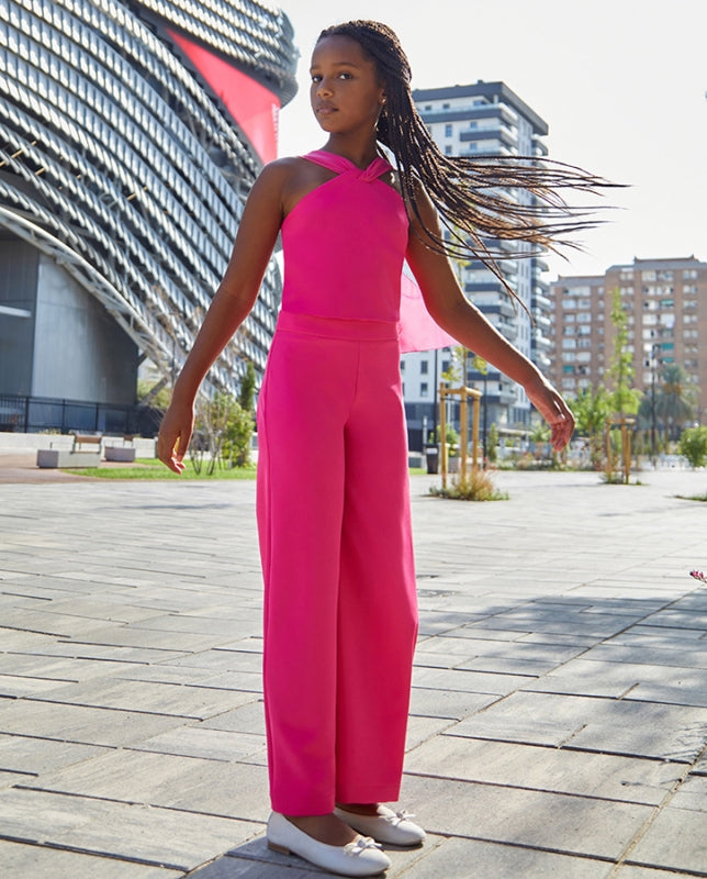 Conjunto de pantalón para niña juvenil de Ceremonia que pertenece a la nueva colección de Primavera Verano de Amaya Fashion for Kids. Este elegante diseño combina un top sin mangas con un pantalón que realza la figura al descubrir el tobillo, creando una silueta sofisticada y moderna. Confeccionado íntegramente en España, garantiza la máxima calidad en materiales y acabados. Ideal para eventos especiales, bodas y celebraciones donde se requiere un look refinado y distinguido. La combinación de prendas permite múltiples opciones de estilismo, adaptándose a diferentes ocasiones formales. Una opción versátil que combina comodidad con elegancia juvenil, perfecta para las niñas que desean lucir impecables en sus momentos más importantes.