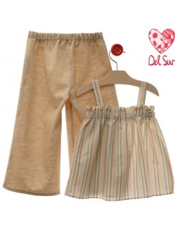 La Familia Pionono de Del Sur presenta este elegante conjunto para niña, que combina una blusa sin mangas confeccionada en tejido de rayas azul y camel con un pantalón de lino en color tierra. Este conjunto ofrece una combinación perfecta de estilo y comodidad, ideal para climas cálidos gracias a la frescura del lino y la ligereza del tejido de la blusa. Fabricado en España con materiales de alta calidad, garantiza durabilidad y un ajuste excelente para que las niñas se muevan con total libertad y elegancia en cualquier ocasión. Un conjunto que une tradición y diseño contemporáneo.