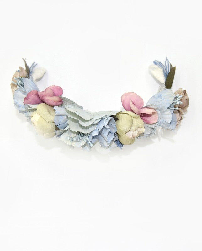 El adorno floral compuesto de flores hechas a mano montadas en corona.