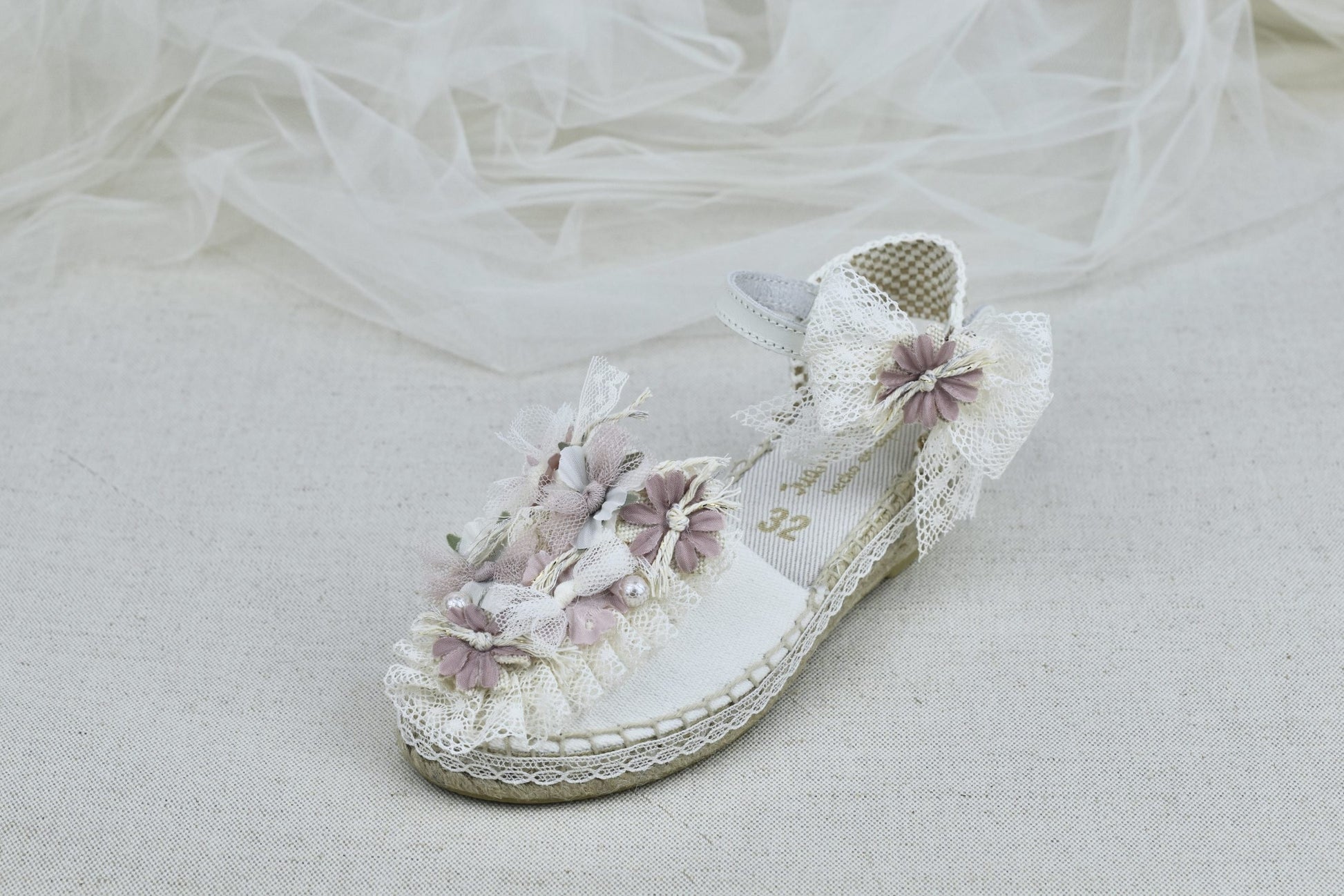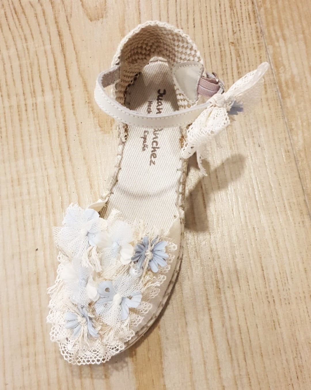 Esparteña con planta almohadillada, adorno montado en puntilla plisada marfil con flores en rosa palo o azul y lazadas en tul y lazo de puntilla en pulsera.