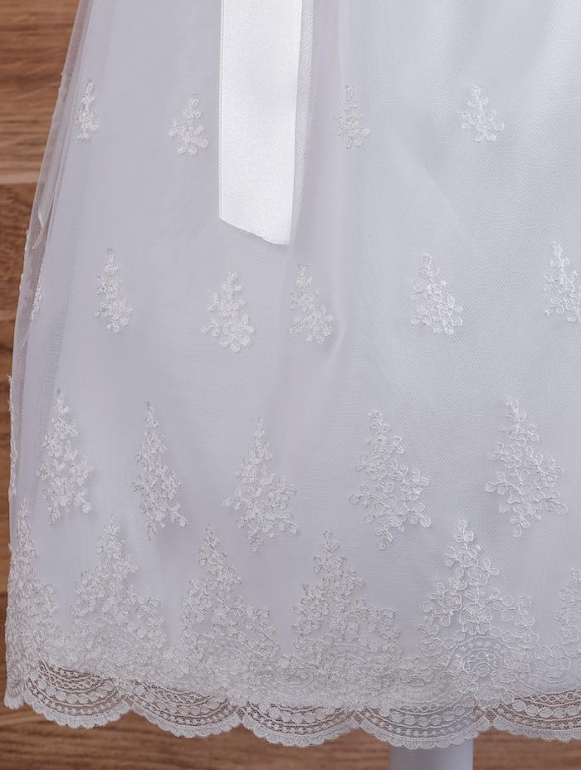 Fabricado en tul bordado con fondo en color beige.