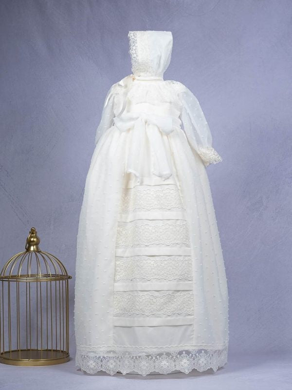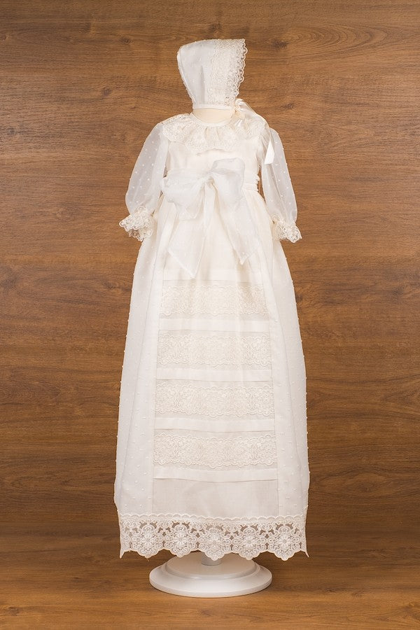 Faldón decorado con delicadas puntillas con preciosos bordados.