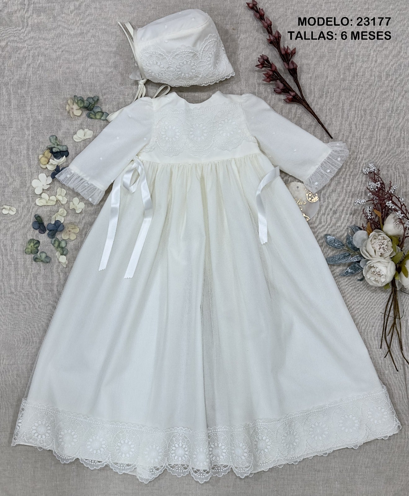 Faldón largo con mangas con una fina puntilla al tono en el cuello, mangas y en el cuerpo.