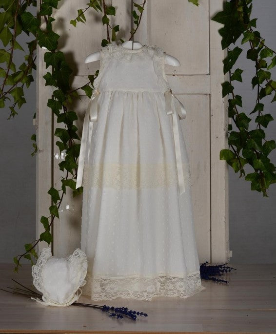 Faldón largo sin mangas con una fina puntilla al tono en el cuello, mangas y en el cuerpo.
