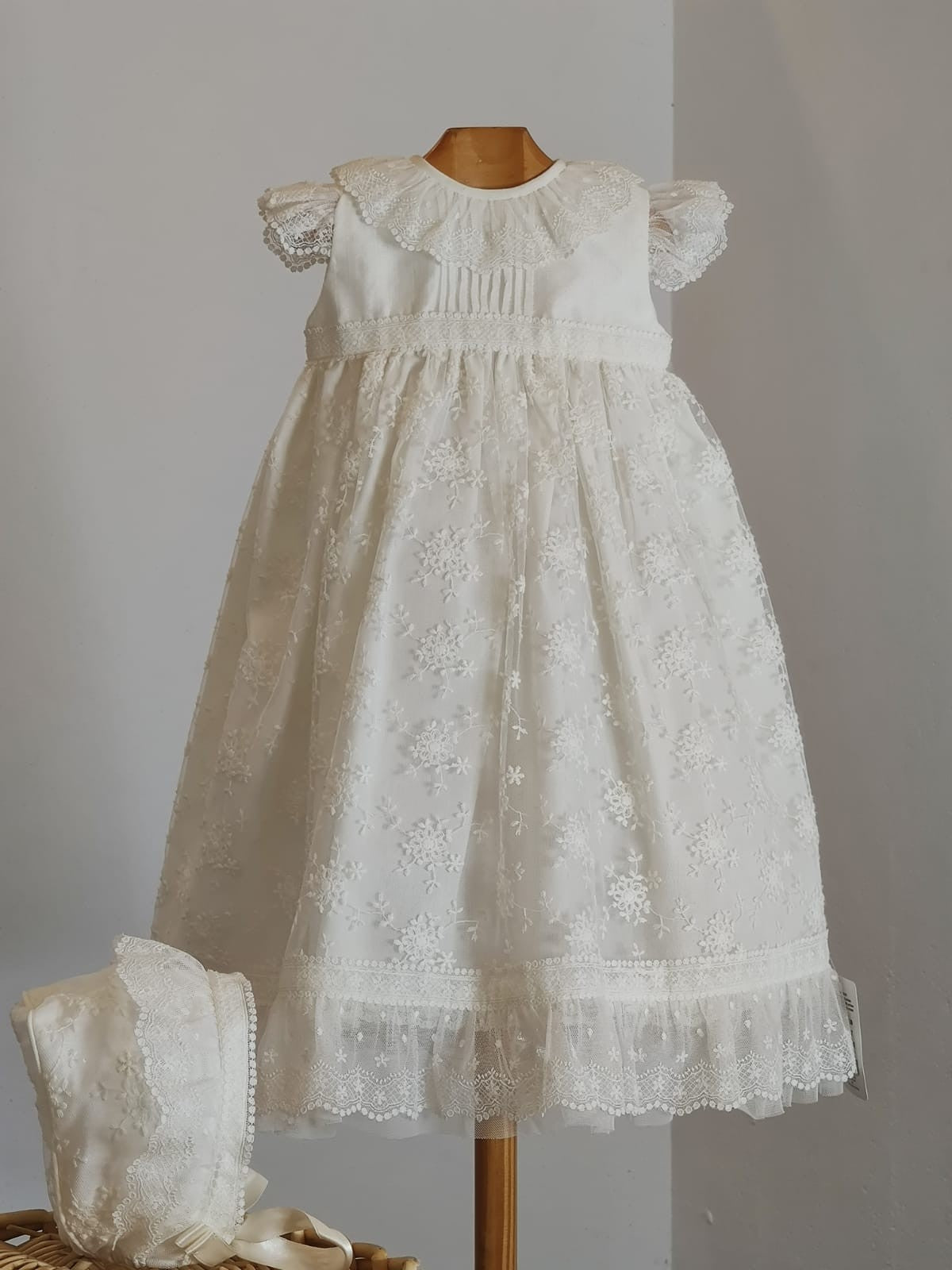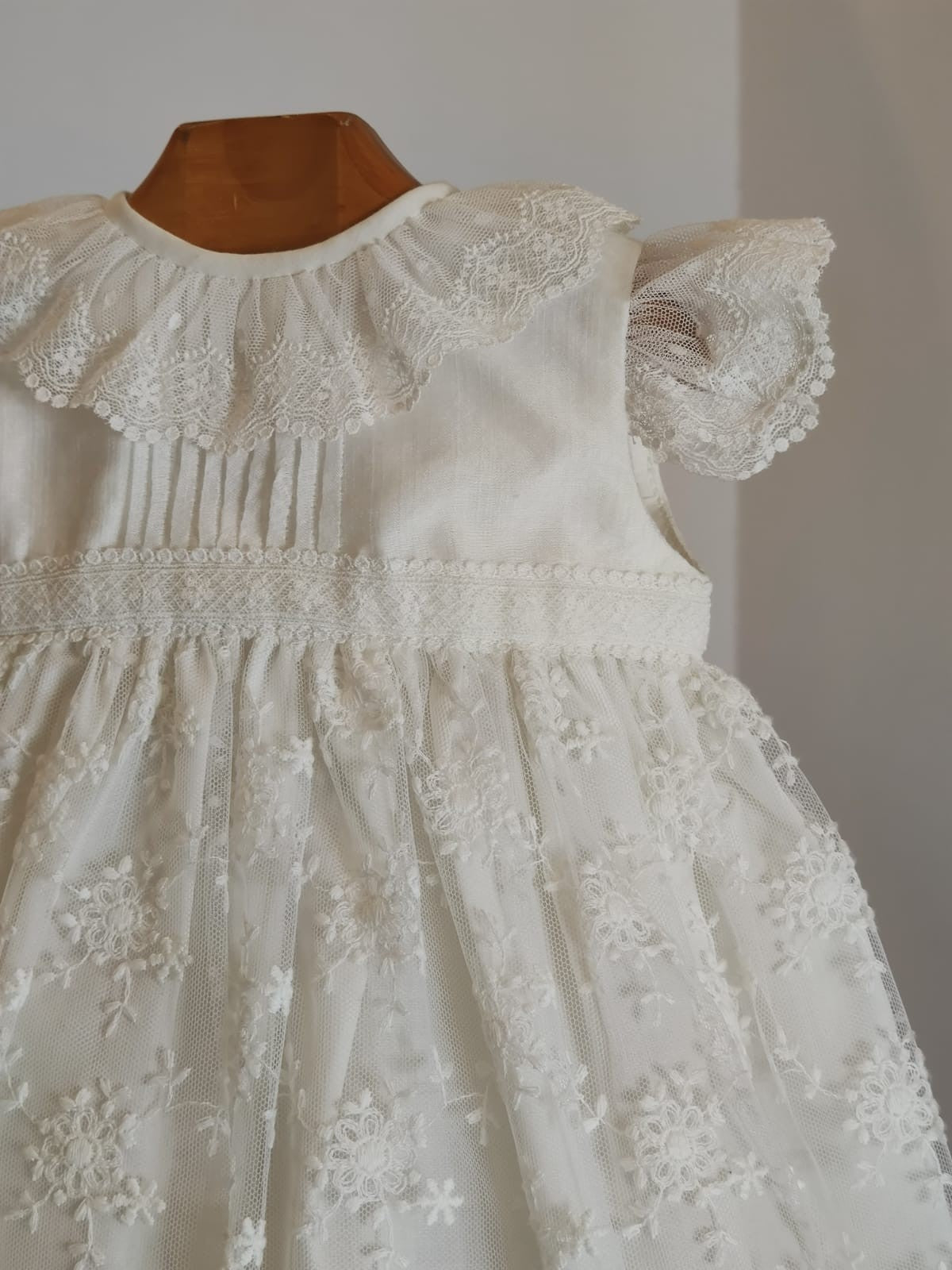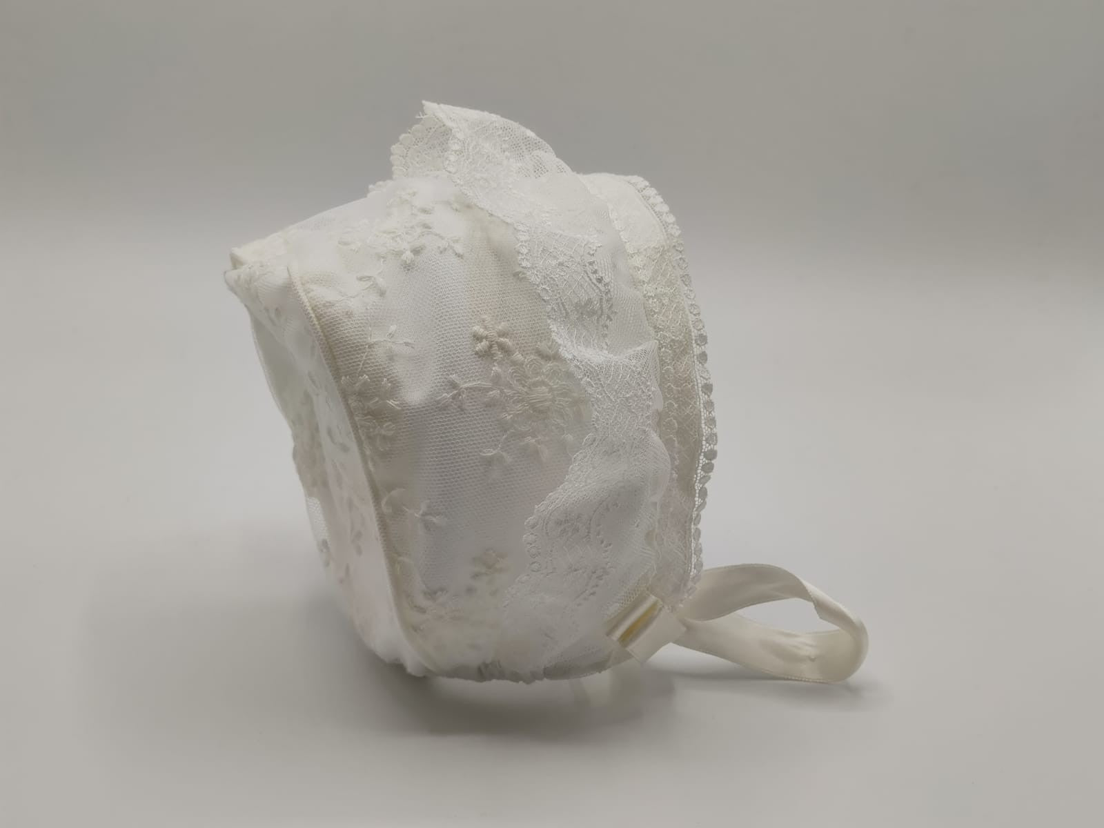 Fabricado en tul bordado en color blanco roto.