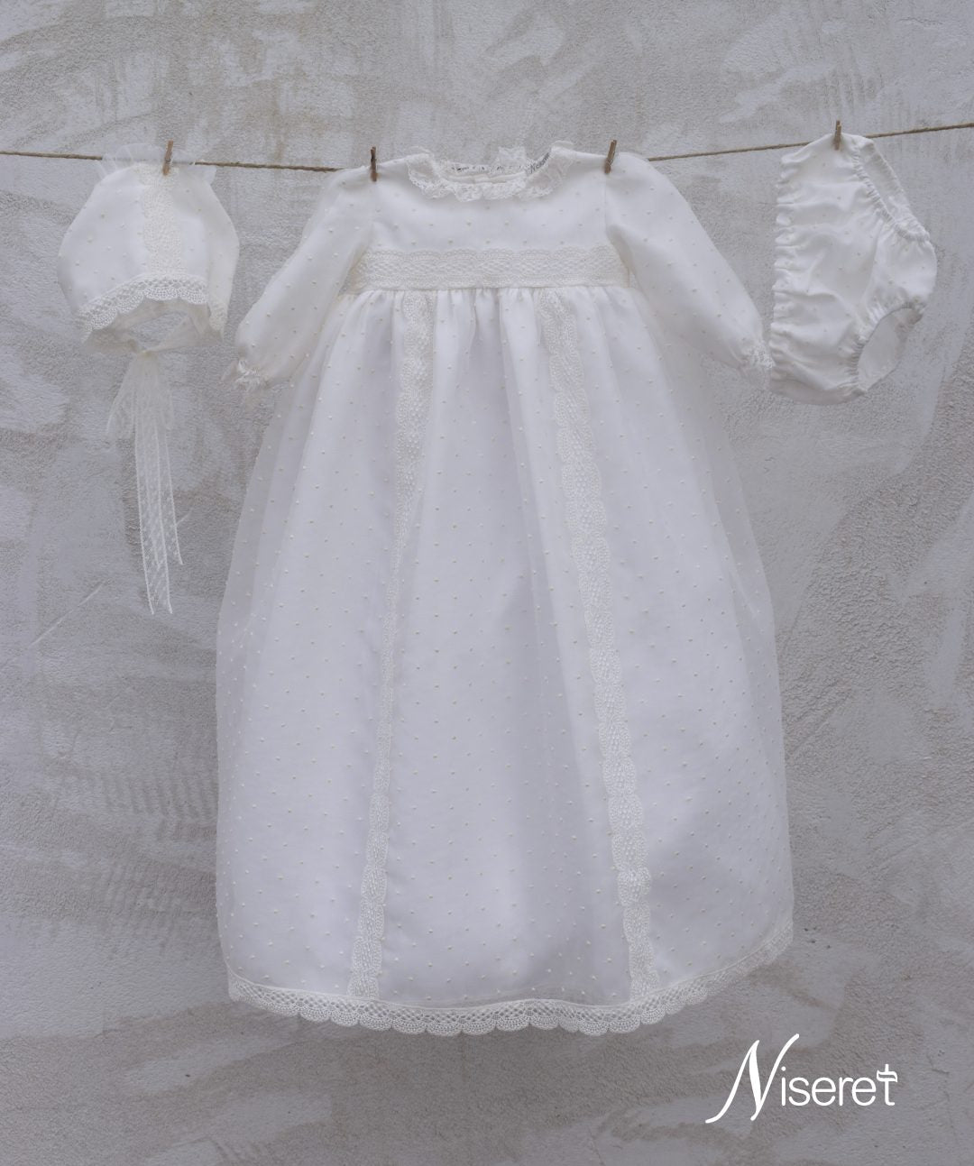 Este faldón de bautizo de la colección de Ceremonia de Niseret está elaborado con organza cristal adornada con plumeti bordado, aportando un toque de elegancia y sofisticación ideal para una ocasión tan especial. Sus acabados en fina puntilla de guipur resaltan la delicadeza artesanal del conjunto, que incluye además una capota y un cubrepañal a juego para ofrecer una presentación armoniosa y exclusiva. Cada detalle está cuidadosamente confeccionado para garantizar comodidad y estilo durante la ceremonia. Fabricado en España, refleja calidad y tradición en cada puntada.