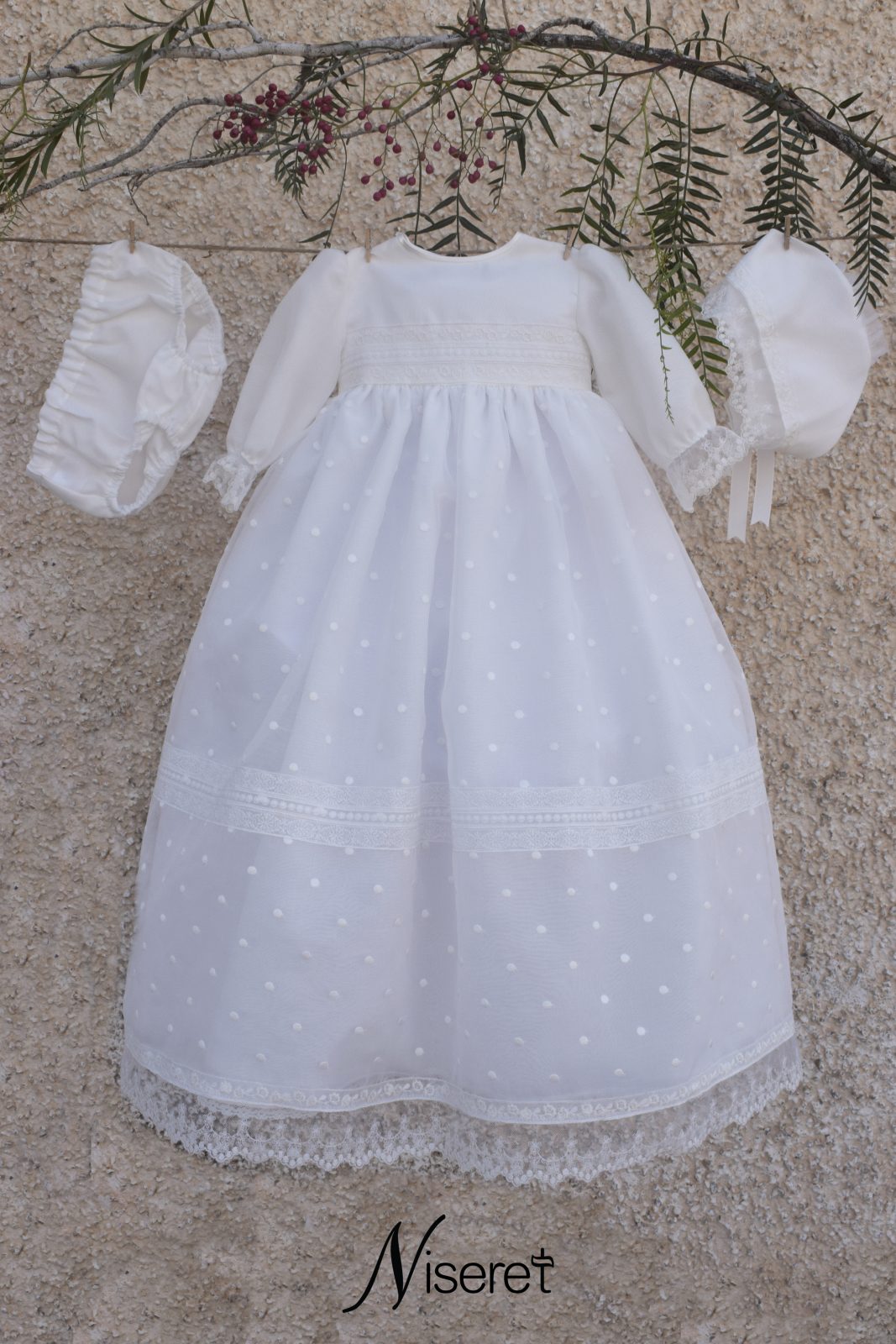 Elegante faldón de bautizo en organza con topos bordados y acabado con delicados encajes bordados.