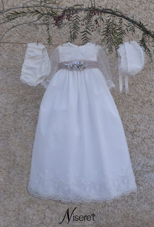 El faldón de bautizo con capota 5553 Niseret es una prenda cuidadosamente diseñada para celebrar ese momento tan significativo. Este batón de tul bordado destaca por su delicado cuerpo decorado con puntillas, mangas elegantes y lazos en los costados que aportan un toque sofisticado. La capota incorpora detalles a juego con el faldón, creando un conjunto armonioso y completo. La pieza se termina con una lazada de tul empolvado adornada con flores, disponible en varios colores para adaptarse a diferentes estilos y preferencias. Además, cuenta con un forro interior que garantiza comodidad y suavidad para el bebé durante la ceremonia. Esta combinación de materiales y detalles convierte al faldón Niseret en una opción ideal para un bautizo inolvidable.