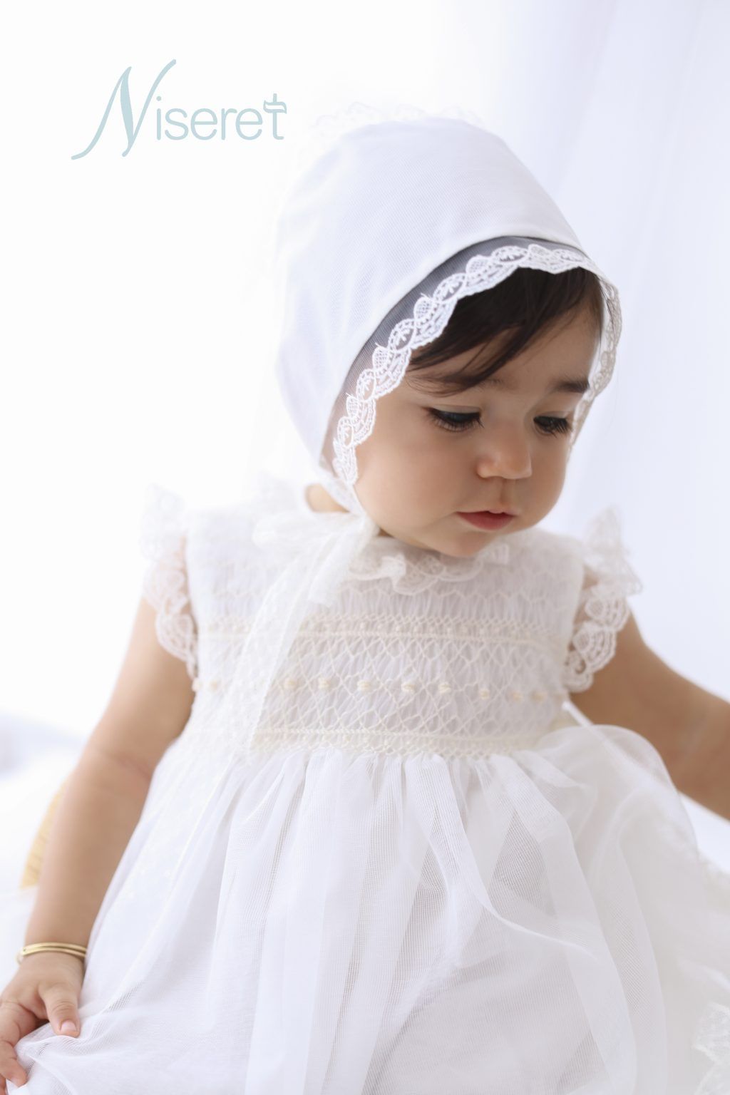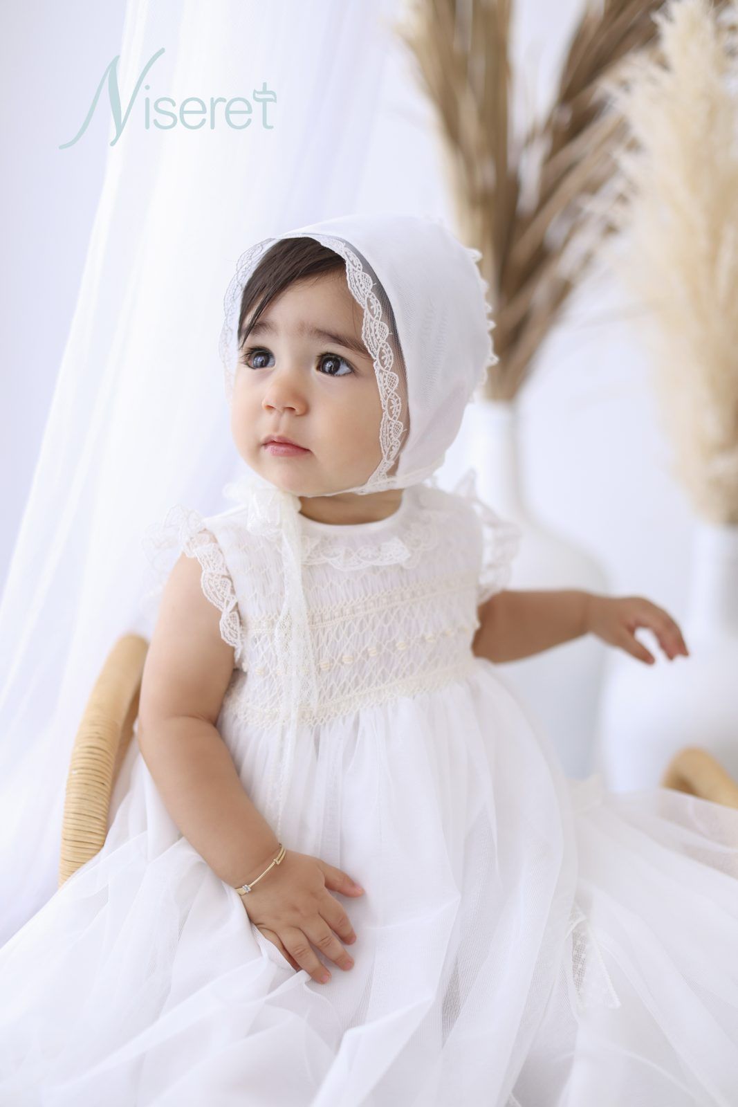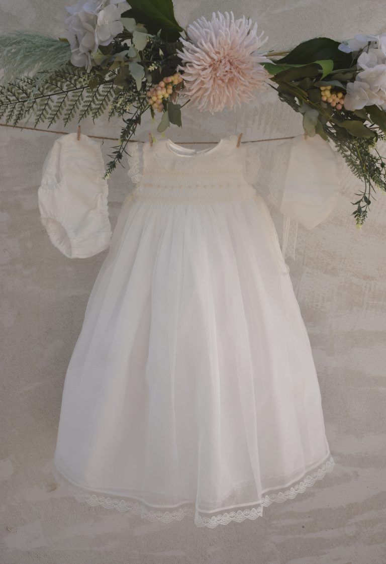Delicado faldón de organza con cuerpo adornado con un elegante bordado a mano en nido de abeja. Un diseño único y artesanal.
