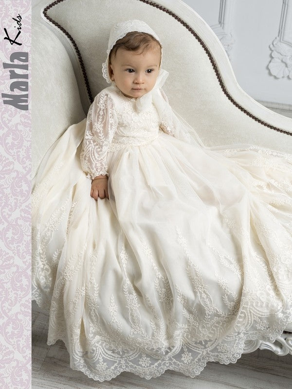 Cuerpo bordado con mangas al codo en precioso tul bordado y falda en tul acabado en preciosos bordados.