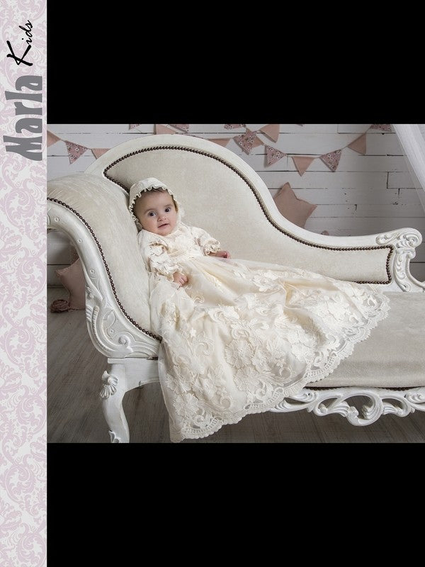 Cuerpo bordado con mangas al codo en precioso tul bordado y falda en tul acabado en preciosos bordados.
