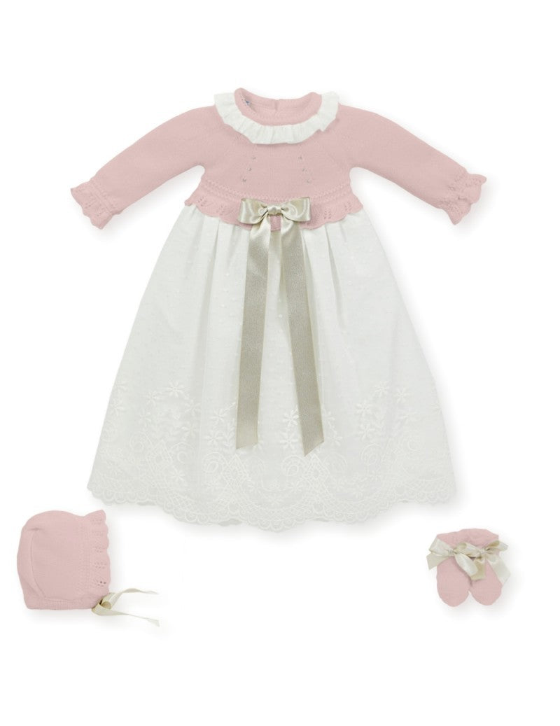 Cuerpo de punto en tono rosa y falda en blanco roto con bonitos bordados.