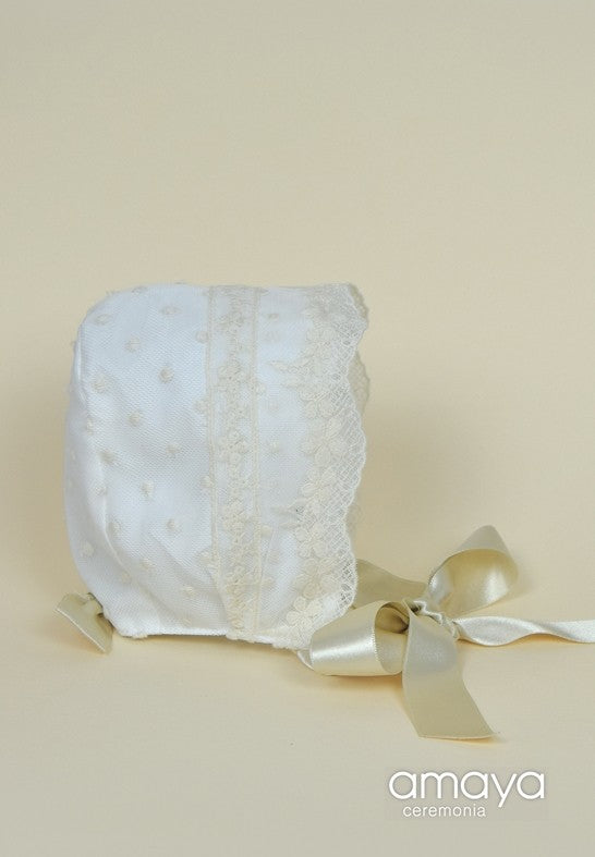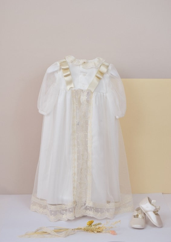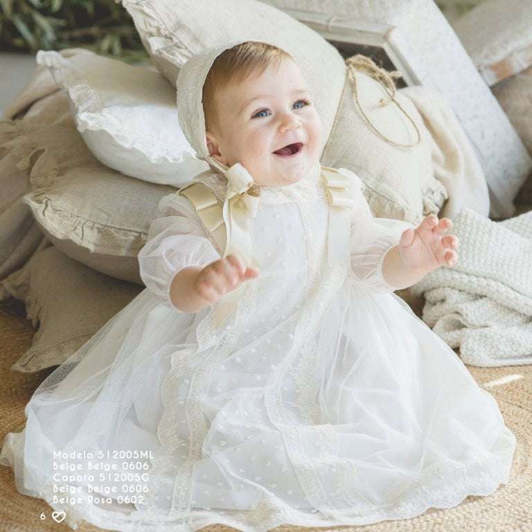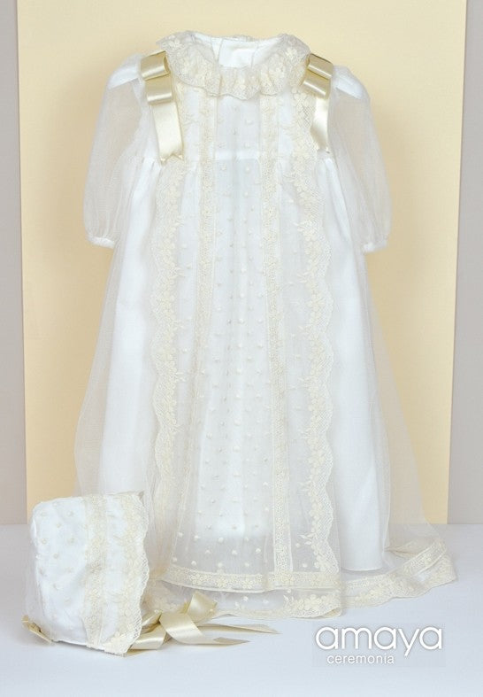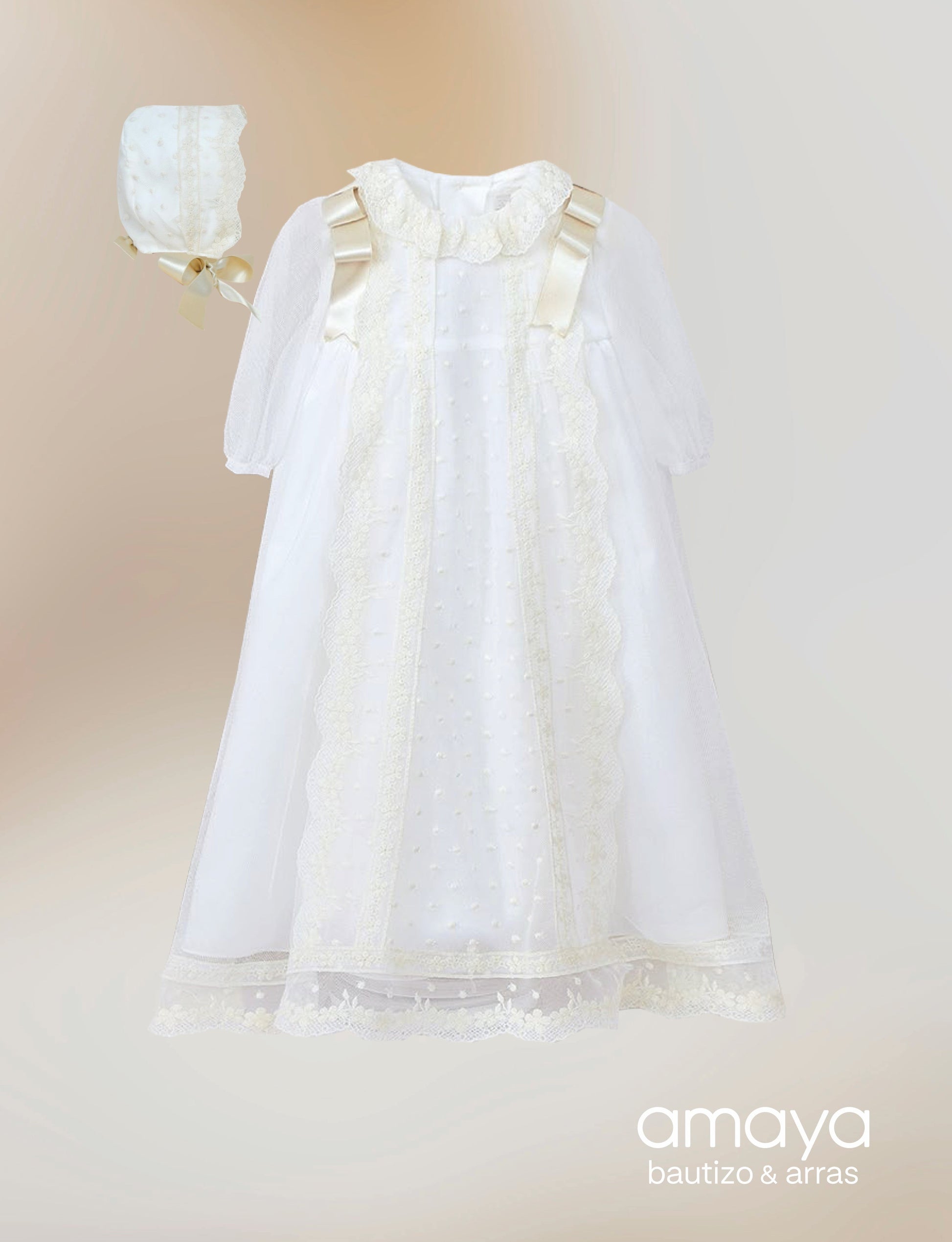 Este faldón corto de la colección Amaya está confeccionado en tul bordado color beige, combinando elegancia y tradición. Su cuerpo presenta detalles en puntilla y mangas largas con lazos en los hombros que aportan un toque delicado y sofisticado. La falda cuenta con finas puntillas y bordados cuidadosamente elaborados que realzan su diseño. Incluye una capota a juego, ideal para completar el conjunto y proteger al bebé con estilo.