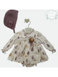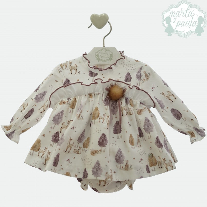 Un Jesusito de bebe niña ideal con estampado de cervatillos en un bosque. Incluye una braguita a juego y lleva un pompón de pelo al pecho de adorno.