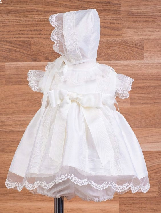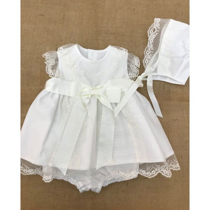 Elegante y sencillo vestido para bebe confeccionado con corte muy romántico en tul bordado, es de manga corta con puntillas en la manga y cuello.