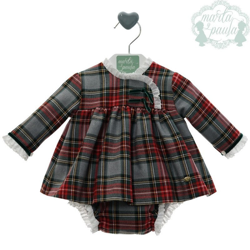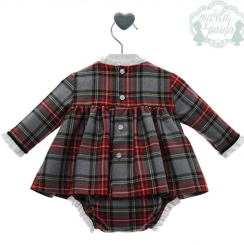 Este jesusito de manga larga está confeccionado en un paño fino con un elegante diseño de cuadros escoceses en tonos gris, verde botella, rojo y mostaza, proporcionando un toque clásico y distintivo. Su corte imperio ofrece comodidad y un ajuste favorecedor para los más pequeños. El detalle de un delicado volantito blanco con puntilla en el cuello, pecherín y puños añade un aire sofisticado sin perder la ternura infantil. En el delantero, dos lacitos de terciopelo verde realzan su encanto, aportando un detalle sutil y elegante. Incluye una braguita a juego para completar el conjunto con armonía. Este producto está fabricado en España, garantizando calidad y atención al detalle en cada prenda. Perfecto para ocasiones especiales, combina estilo tradicional con acabados cuidados para vestir a los niños con comodidad y elegancia.