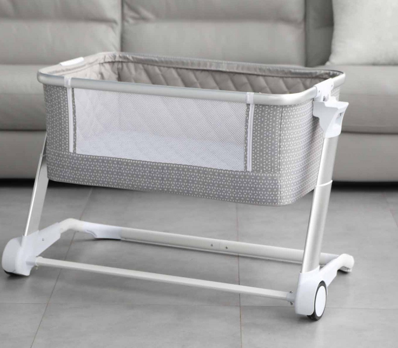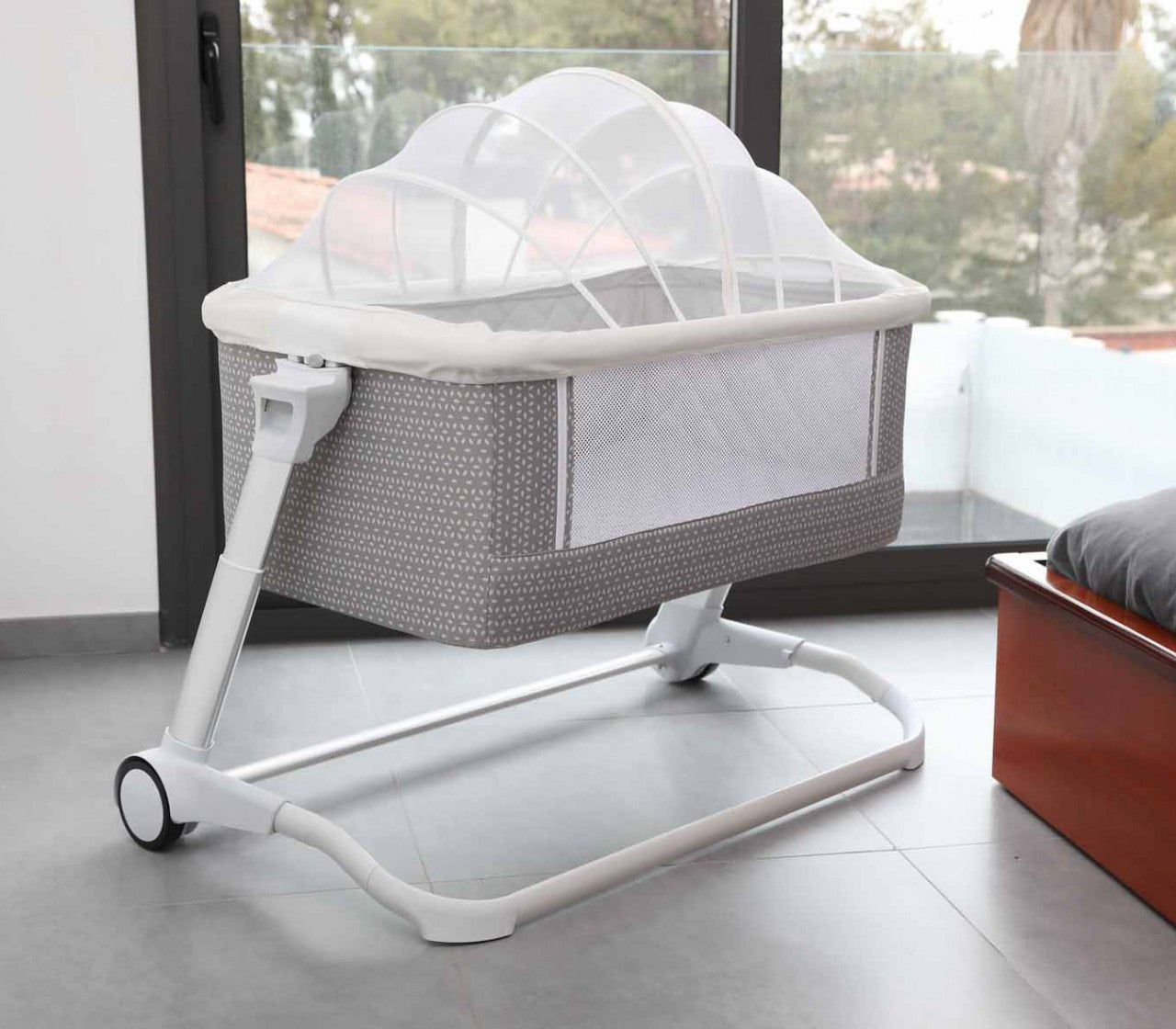 Dispone de cinco posiciones de altura regulables, que la hacen adaptable a cualquier cama. El lateral incorpora una ventana transpirable de fácil apertura mediante cremalleras. Cerrada, puede utilizarse como cuna independiente.