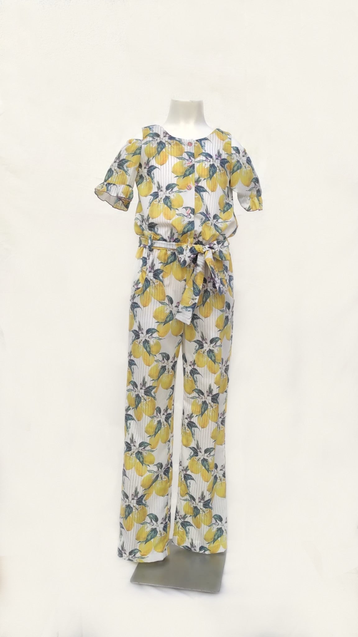 Mono largo para niña juvenil de Ceremonia que pertenece a la nueva colección de Primavera Verano de la firma Anavig, confeccionado en tejido de algodón fresquito de color amarillo limón estampado.