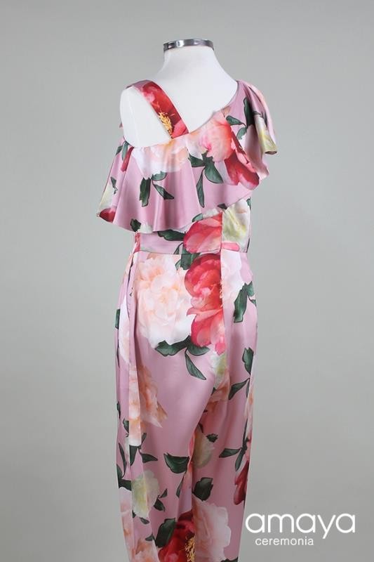 Llamativo mono largo para niña juvenil confeccionado en tejido estampado de satén de muy alta calidad con flores grandes, tejido de mucha caída.
