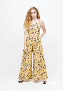 Mono largo para niña juvenil de Ceremonia que pertenece a la nueva colección de Primavera Verano de la firma Amaya Fashion for Kids, confeccionado en tejido de color mostaza estampado.