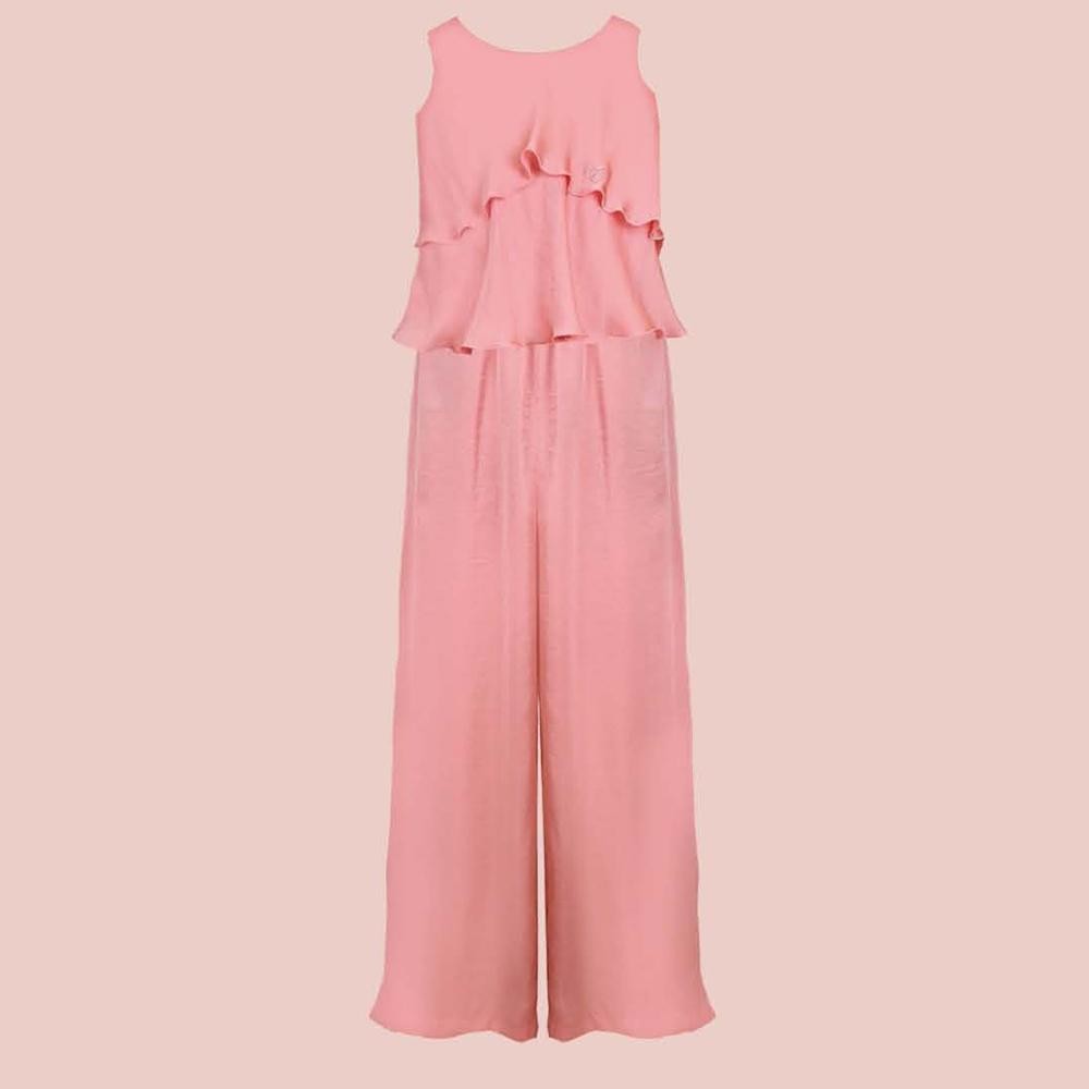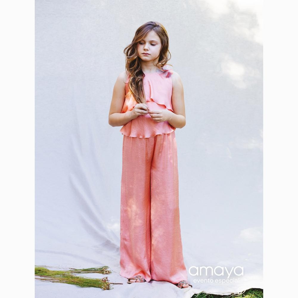 Este mono para niña juvenil de ceremonia forma parte de la nueva colección Primavera-Verano de Amaya Fashion for Kids. Está confeccionado en suave tejido color salmón, ideal para ocasiones especiales durante la temporada cálida. Su diseño sin mangas incluye dos elegantes volantes en el cuerpo, elaborados en la misma tela, que aportan un toque de frescura y sofisticación. Además, este mono está fabricado en España, garantizando calidad y cuidado en cada detalle. Perfecto para eventos formales donde la comodidad y el estilo deben ir de la mano.