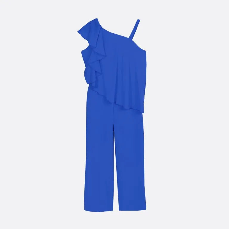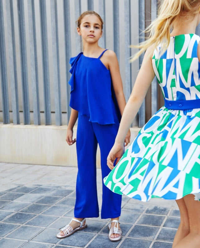 Mono Ceremonia Bombay 614673 Amaya es una prenda elegante diseñada especialmente para niñas juveniles, ideal para ocasiones especiales. Pertenece a la nueva colección de Amaya Fashion for Kids, reconocida por su combinación de estilo moderno y calidad. Este mono en azulón destaca por su corte de pata recta que aporta comodidad y estilo, mientras que sus tirantes asimétricos añaden un detalle sofisticado y contemporáneo. La parte superior presenta un volante en capa que cae suavemente, creando un efecto visual delicado y único.