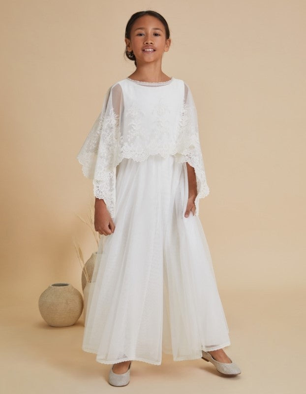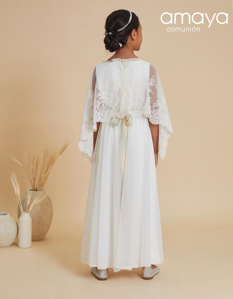 Vestido de comunión desmontable en mono de la nueva colección 2025 de la firma Amaya Fashion for Kids realizado en tejido de tul.