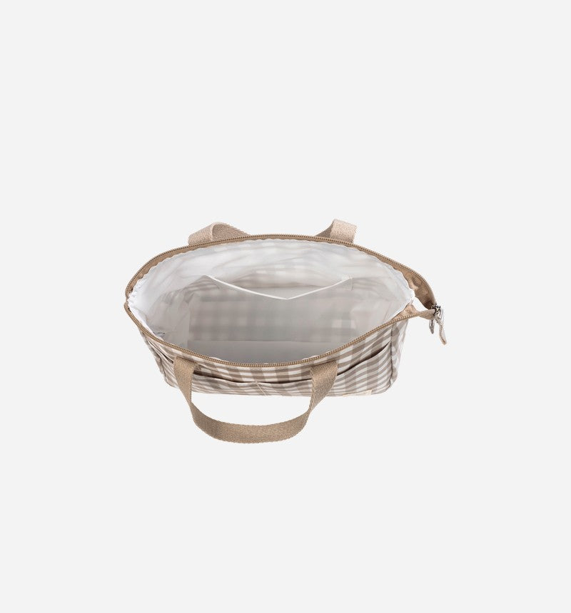 Cuenta con asas ubicadas en la parte superior para cargar el bolso y tiene un cierre seguro de cremallera para evitar que algo pueda salirse.
