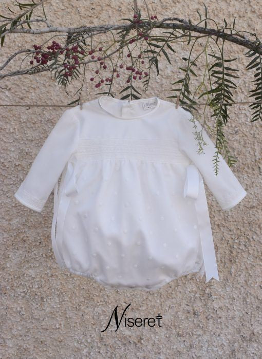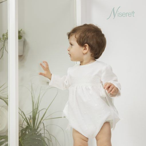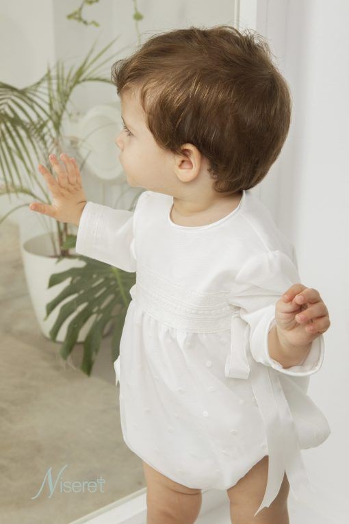 Elegante ranita de bautizo confeccionada en organza decorada con topos bordados y rematada con delicados encajes, que aportan un toque de sofisticación y ternura a esta pieza única. Su manga larga ofrece comodidad y protección, ideal para las celebraciones en climas frescos. Este pelele combina un diseño clásico con un estilo actual, manteniendo su relevancia y belleza a lo largo del tiempo gracias a la alta calidad de sus tejidos y a su cuidadosa confección. Fabricado en España, garantiza un acabado impecable y una prenda duradera para ese día tan especial.