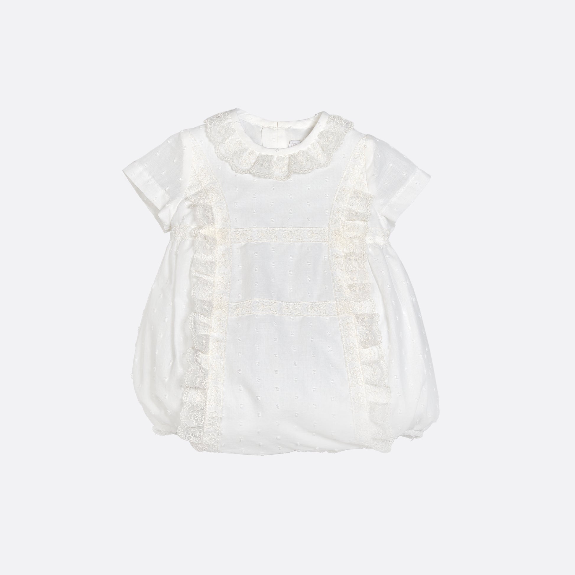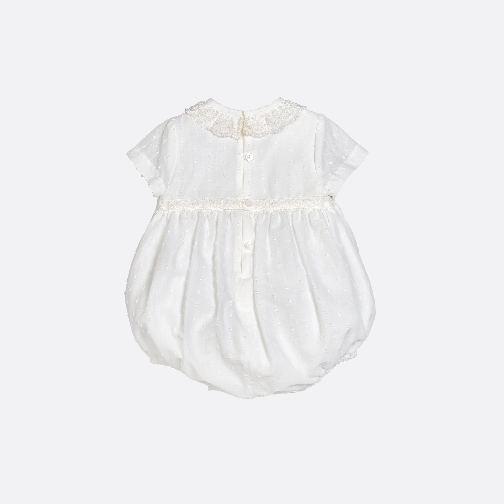 Coqueto pelele de bebé de manga corta de la Colección Romantic Roses, que va haciendo juego de entredoses y puntilla crema sobre una base de violé plumeti. Y por supuesto, puedes completar el look con los zapaticos, el pack de babero, chupetero y pañuelo, todo a juego y así hacerlo aún más especial para un día inolvidable.