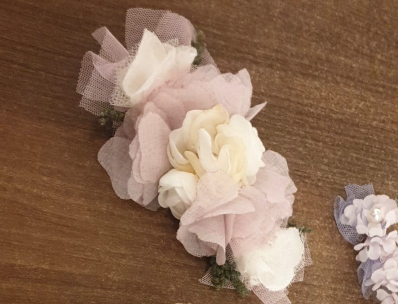 Precioso tocado de comunión hecho a mano en tonos pastel.