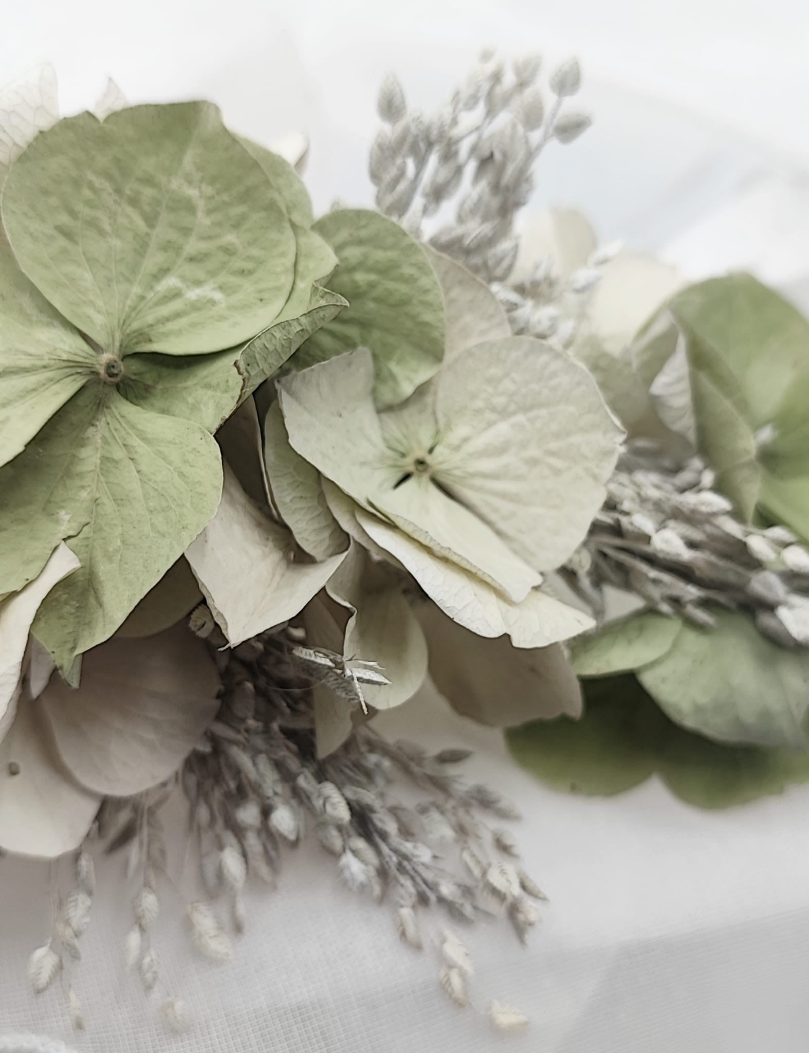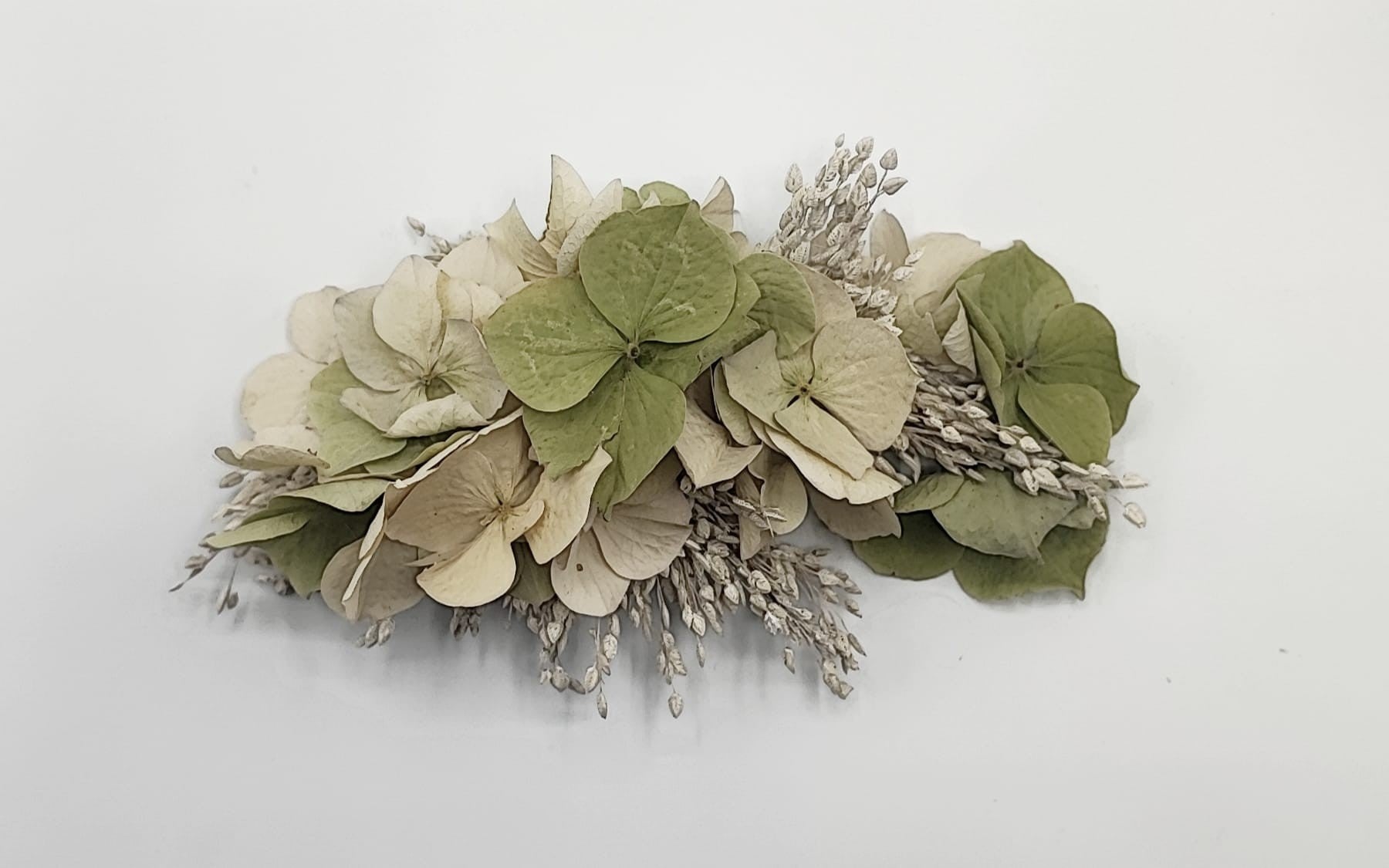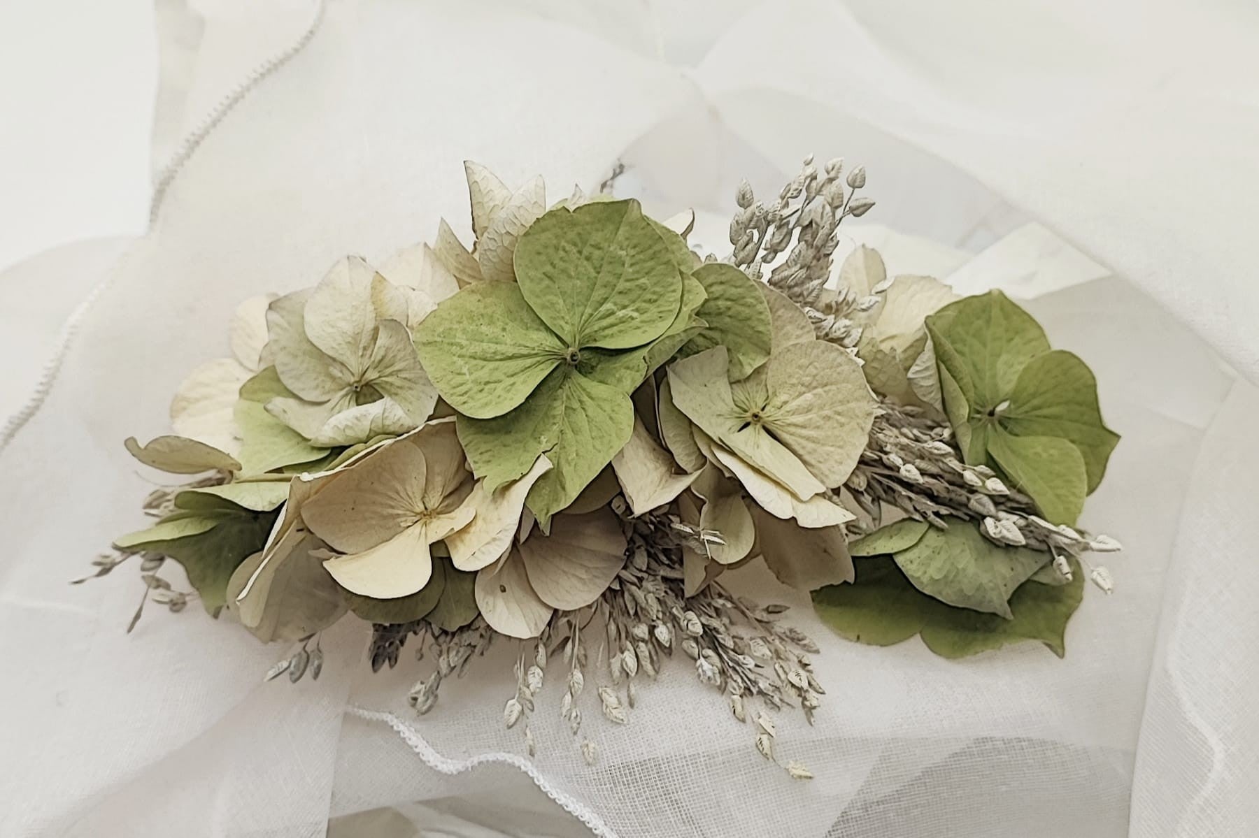 El adorno floral compuesto de flores naturales hechas a mano en tonos verdes, viene con una peineta para poder sujetarlo en el pelo.