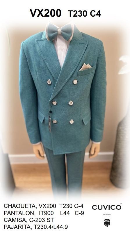 Americana color océano de dos botones con ribetes a juego con la corbata y el pañuelo. Pantalón slim fit a juego con la chaqueta.