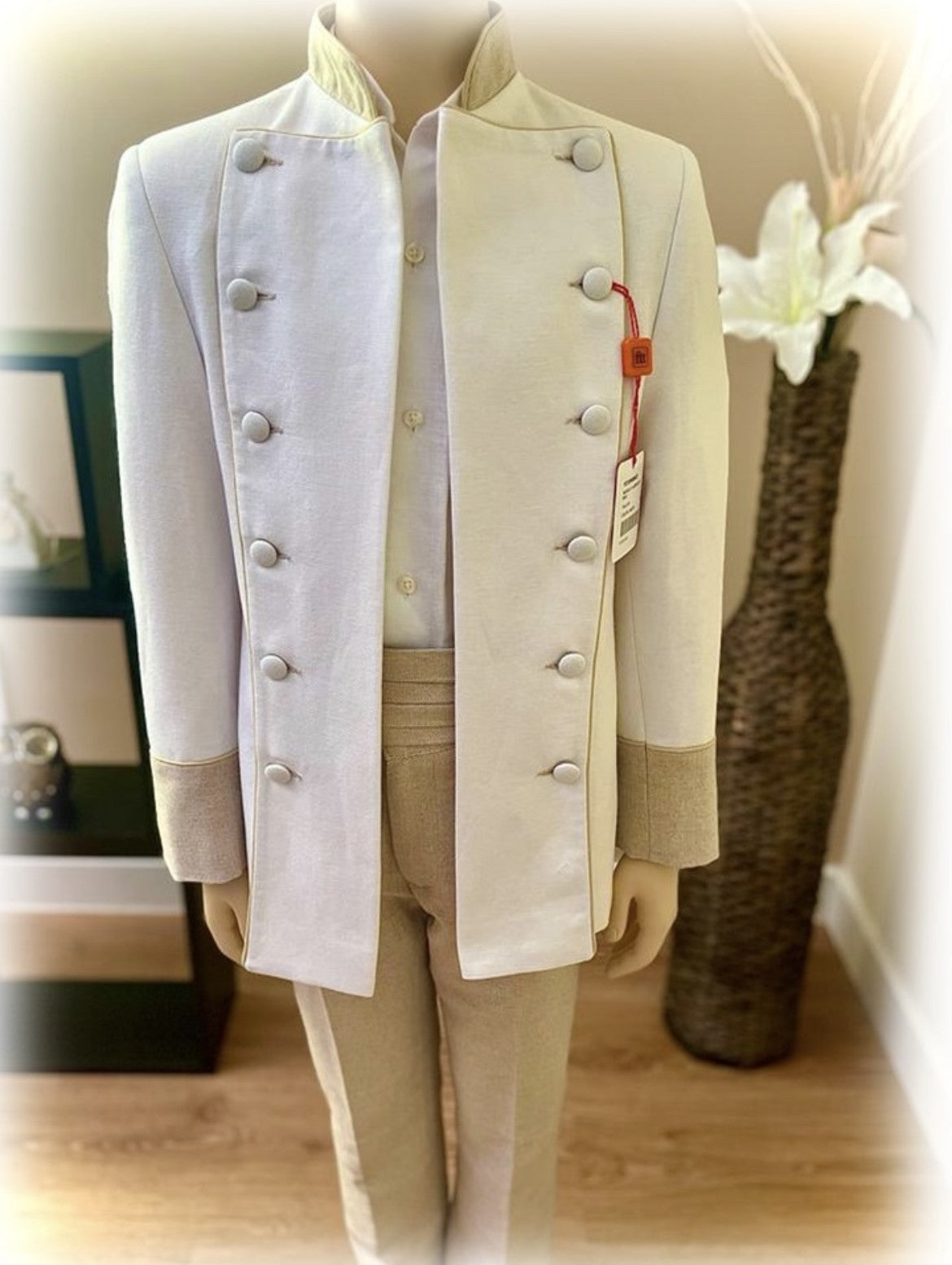 Traje de comunión estilo Príncipe compuesto por cuatro piezas: chaqueta, camisa, fajín y pantalón. La chaqueta abotonada en tono crudo presenta un cuello mao en color arena. La camisa, también con cuello mao, es de un blanco roto. El pantalón y el fajín, a juego, son de tono arena. Producto fabricado en España con un tiempo de entrega estimado entre 30 y 45 días.