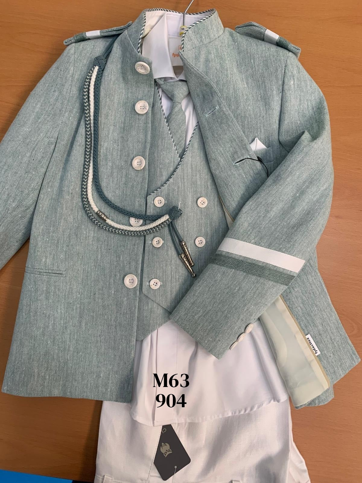 Traje almirante de comunión confeccionado en tejidos de primera calidad con acabados artesanales. Este conjunto de 5 piezas combina elegancia clásica con detalles contemporáneos: chaqueta americana en verde seco con cuello mao, chaleco coordinado, camisa, corbata a juego y pantalón en color crema. La prenda destaca por sus galones y escudo bordado a mano en la chaqueta, botones y detalles perfectamente coordinados. El pantalón, completamente forrado, incorpora bolsillos funcionales y gomas laterales para mayor comodidad y ajuste. Fabricado íntegramente en España, este traje garantiza la máxima calidad en cada costura y detalle, proporcionando al niño una presencia distinguida y sofisticada en su día especial.
