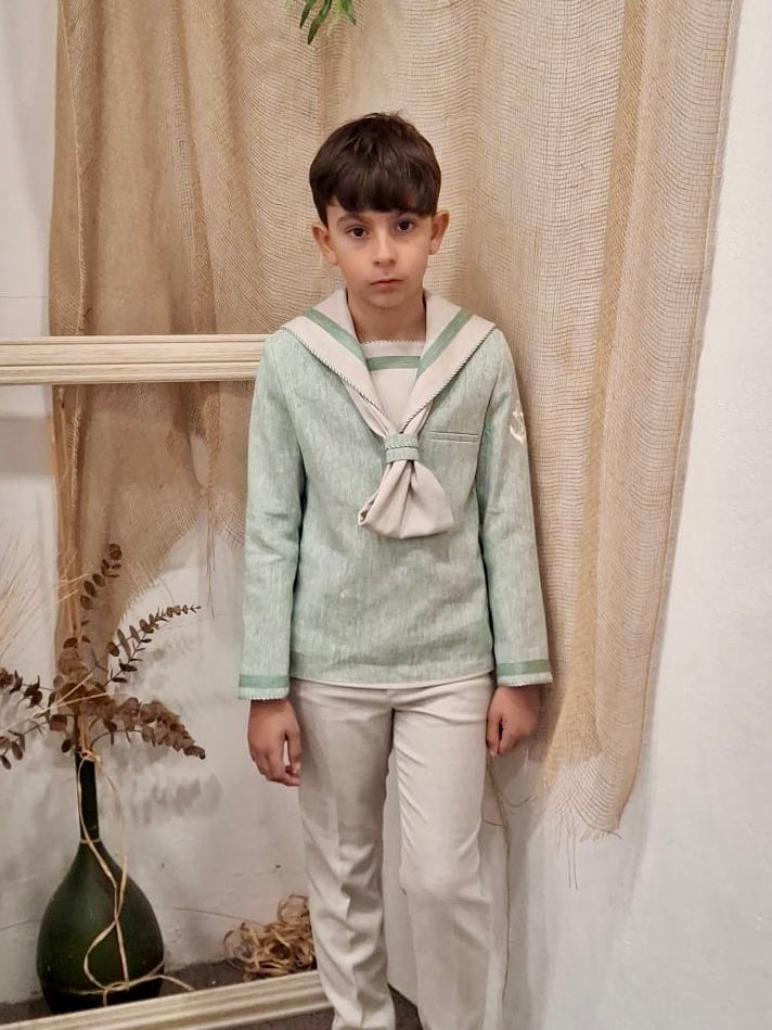 Producido íntegramente en España, este traje refleja el compromiso con la excelencia mediante tejidos de primera categoría y acabados realizados manualmente. La combinación de colores —verde y arena— ofrece una alternativa contemporánea al marinero tradicional, permitiendo que el joven luzca una propuesta diferenciada sin renunciar a la elegancia clásica. Una prenda que trasciende la ocasión y se convierte en referencia de calidad y buen gusto.
