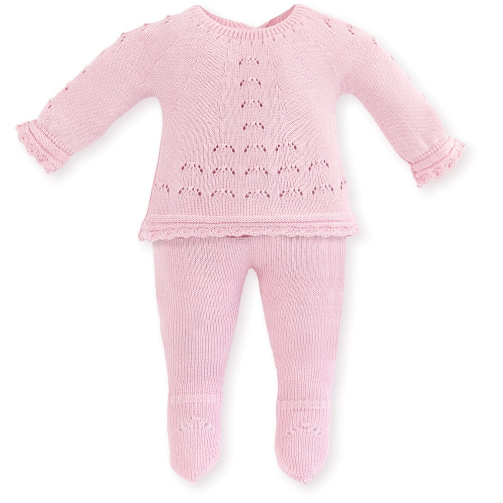 Adornado con calados en los hombros, puños y bajo. Pantalón con pie a juego.