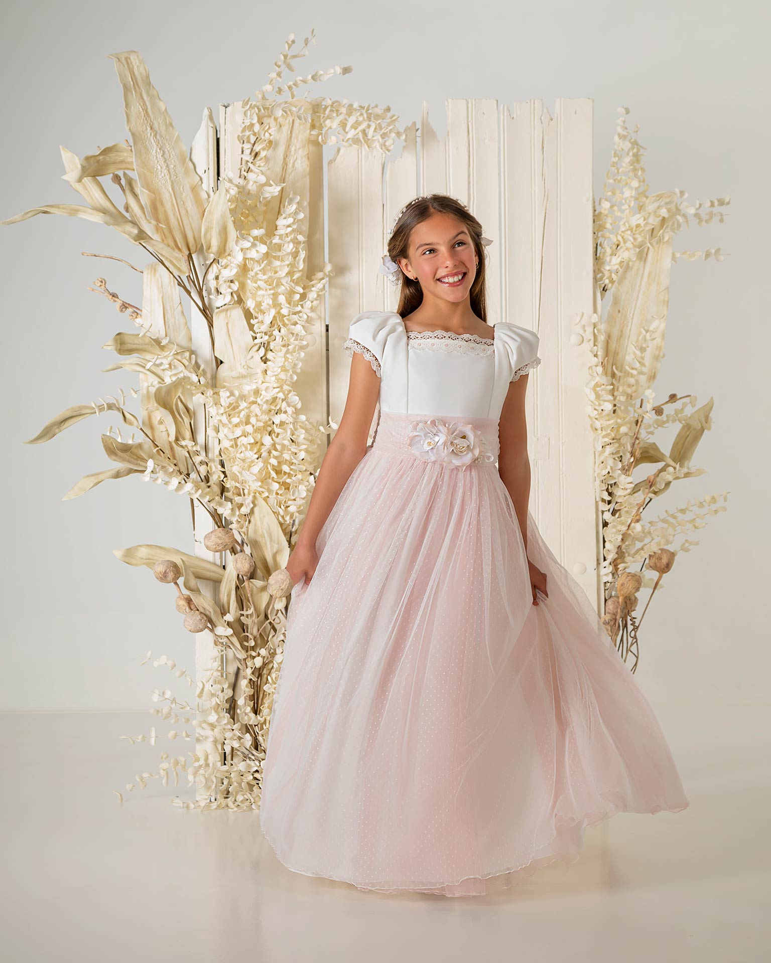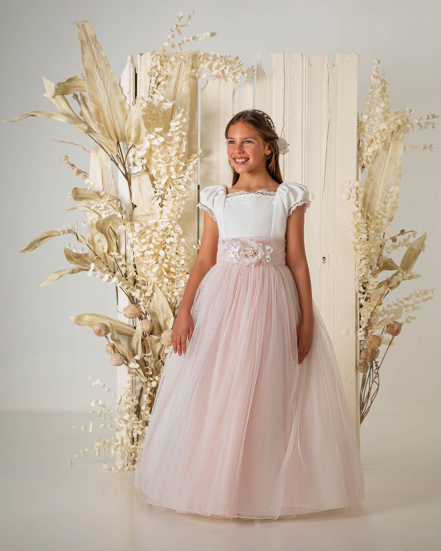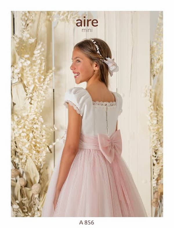 El vestido de comunión 2026 Aire Barcelona A856 destaca por su diseño romántico y elegante, ideal para una ocasión tan especial. Está confeccionado en tul con delicados topos, que aportan textura y sofisticación. Sus adornos florales realzan la belleza del conjunto, mientras que el escote recto y la manga caída proporcionan un aire clásico y refinado. La espalda cuadrada añade un toque moderno y equilibrado al vestido. Su largo elegante completa un look armonioso, ideal para una comunión memorable. Cada detalle está cuidado para garantizar comodidad y estilo durante toda la celebración.