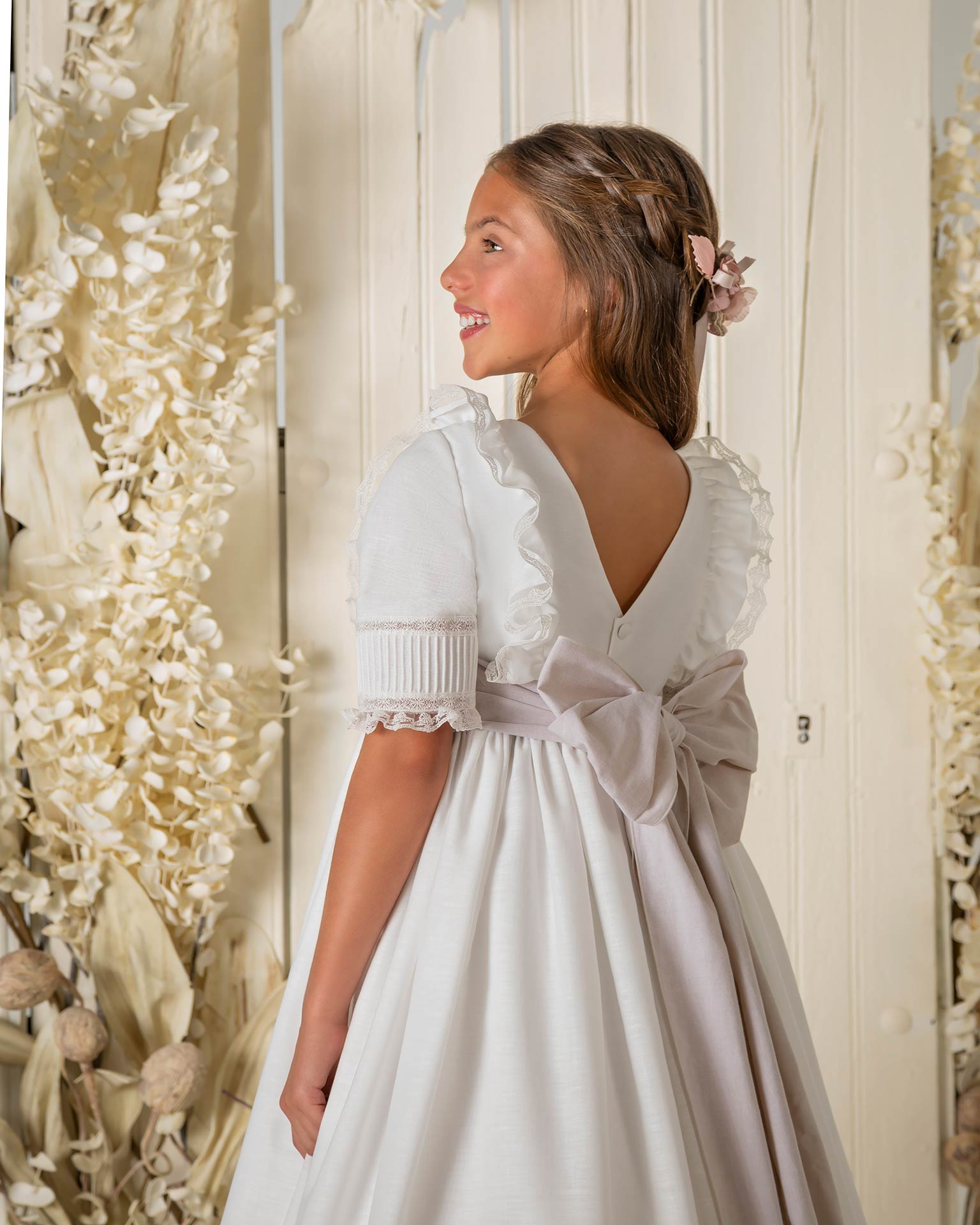 Vestido de comunión estilo clásico con tablas en lino; con escote y espalda cuadrados, manga al codo y gran lazada en la espalda.