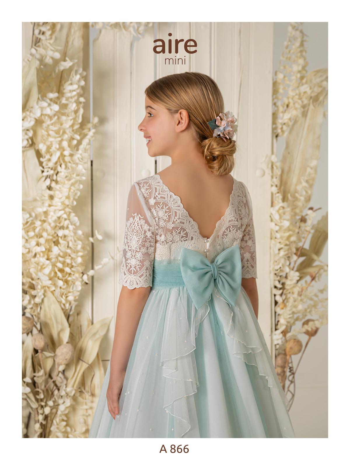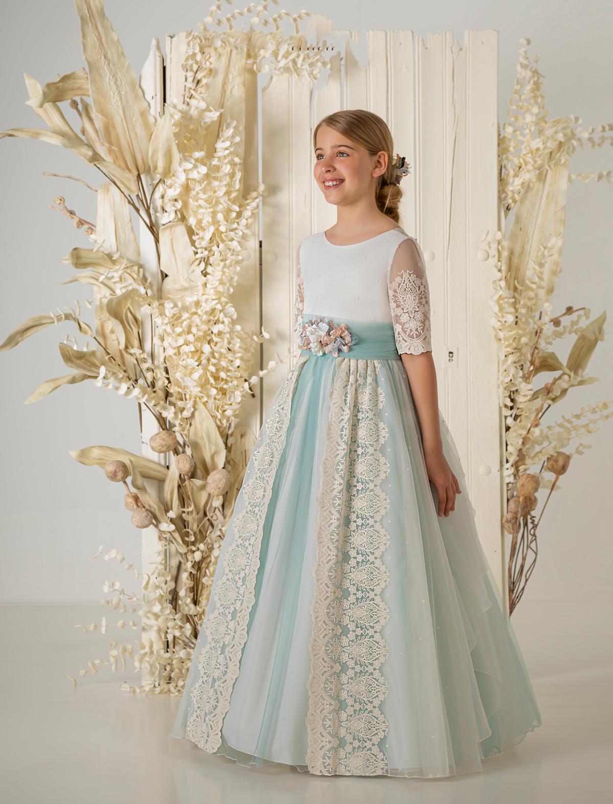 Vestido de comunión estilo romántico de tul bordado; con escote y espalda abierta, manga al codo y gran lazada en la espalda.