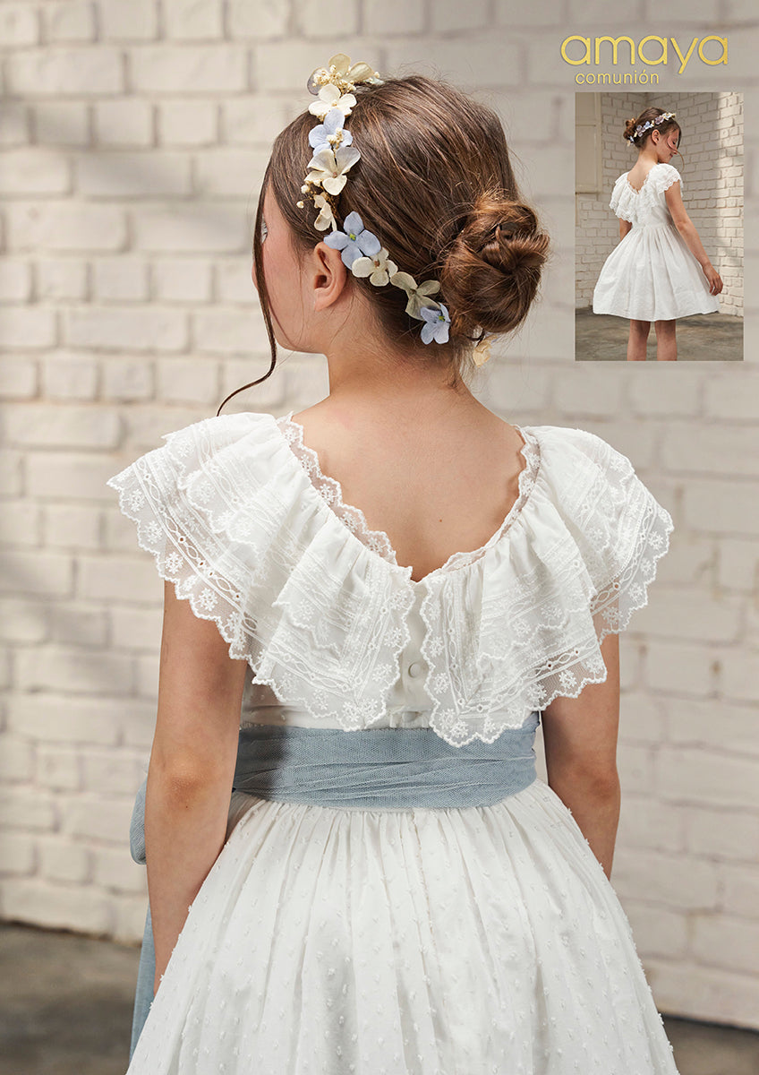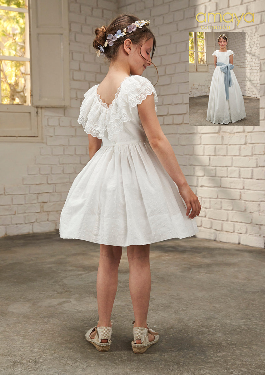 El Vestido de Comunión Convertible 2026 Amaya 636047 está confeccionado en algodón de plumeti bordado, que otorga una textura suave y un acabado delicado ideal para una ocasión tan especial. Su diseño combina una falda corta con una sobrefalda larga, adaptable para el momento solemne de la ceremonia, ofreciendo versatilidad y comodidad. El cuerpo y las mangas están adornados con puntillas finas, que aportan un detalle sutil y sofisticado sin sacrificar la ligereza.