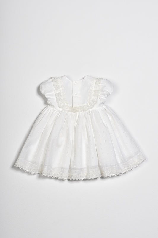 Vestido de voilé plumeti crudo con cubrepañal a juego. El cuerpo va montado con la puntilla y entredoses en tonos crema, creando un ligero contraste. Su manga es corta abullonada para que sea una prenda fresquita. Su falda continúa el juego de puntillas en el bajo y entredoses, va fruncidita. Incluye el cubrepañal del mismo voilé plumeti crudo y con lindos lacitos en los laterales de las patas. Para elevar más el vestido, tienes varios accesorios a juego como turbante o capota, zapatitos, babero, chupetero y pañuelo de la colección Romantic Roses.