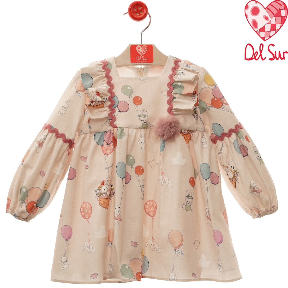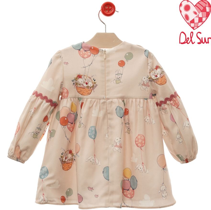 Vestido de la colección Annie de Del Sur de manga larga con print de conejitos en rosa palo y azul.