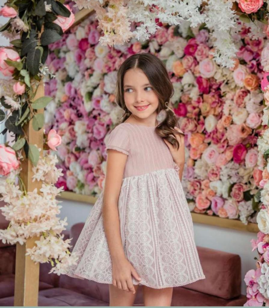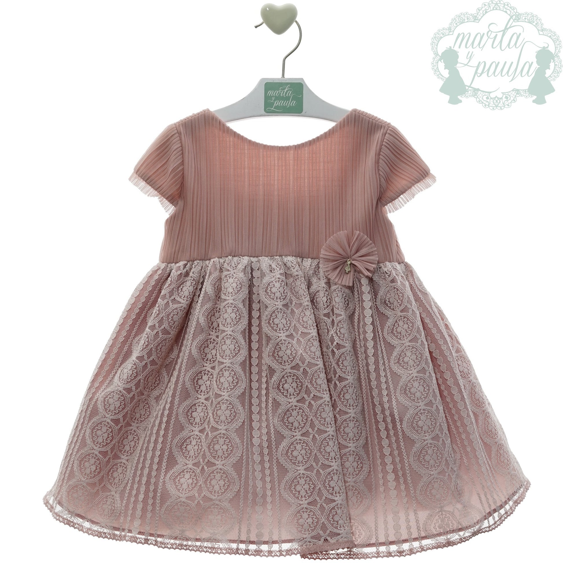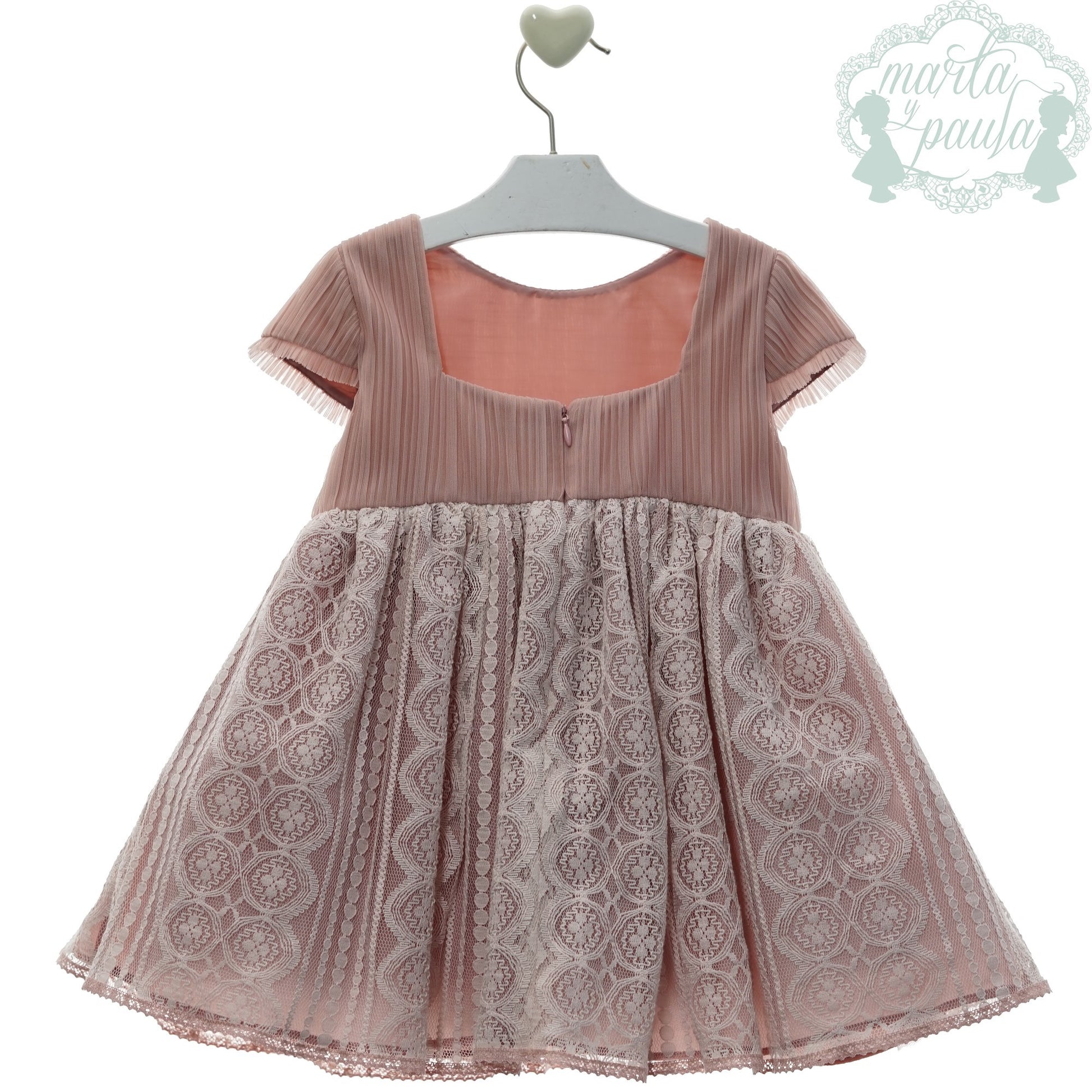 Vestido de manga corta en color rosa palo con cuerpo en tejido plisado y falda en tul con bonitos encajes.